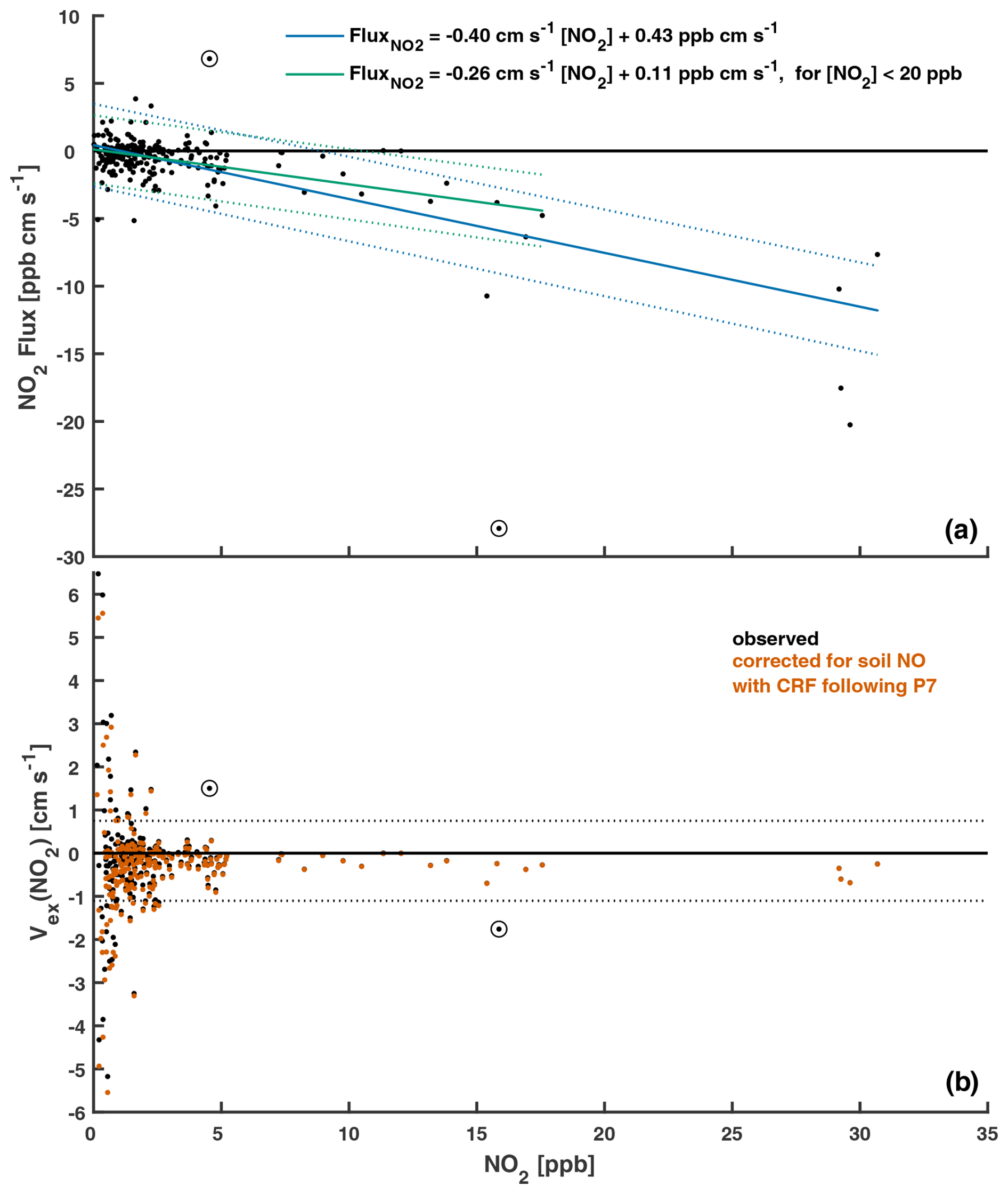 The canopy compensation point for NO2 is the ambient above-canopy concentration at which point consumption (i.e., dry deposition) and production (i.e., soil emission) are in balance (Duyzer et al., 1995). Studies of above-canopy NO2 exchange have observed aggregate fluxes to be upward (Min et al., 2014; Vaughan et al., 2016), downward (Coe and Gallagher, 1992; Horii et al., 2004; Walton et al., 1997), and not significantly different from zero (Geddes and Murphy, 2014) – highlighting the importance of knowledge of below-canopy NOx emission and subsequent uptake and reaction prior to attempting interpretation of above-canopy fluxes. Although foliar compensation points for NO2 – the concentration below which vegetation is proposed to become a net source of NO2 – have been observed in the past via leaf-level chamber measurements to be generally < 2 ppb (Geßler et al., 2002; Sparks et al., 2001; Weber and Renenberg, 1996), recent chamber studies using highly specific NO2 detection methods have failed to observe foliar emission (Breuninger et al., 2013; Chaparro-Suarez et al., 2011; Delaria et al., 2018, 2020; Wang et al., 2020). By restricting analysis to (i) nocturnal conditions when RH is generally high (Fig. S7) and stomata are assumed to be closed (Sect. 4), and to (ii) well-established turbulence (u∗ > 0.2 m s−1), we find that monthly aggregate Vd(NO2) is relatively constant in the range of 0.2–0.3 cm s−1 across April–November, with expected large variability on finer timescales (i.e., σ=0.35 cm s−1 across the hourly dataset). Linear regression of hourly nocturnal NO2 flux vs. ambient NO2 concentration (Fig. 2) yields a Vex(NO2) of −0.40 cm s−1 (p < 0.01) over the entire NO2 concentration range (up to ∼ 30 ppb) and −0.26 cm s−1 (p < 0.01) when the four outlying hourly observations beyond 20 ppb NO2 are excluded – consistent with the findings of Horii et al. (2004). An inferred Vd(NO2) of 0.21 cm s−1 is obtained after subtraction of Vchem=0.05 cm s−1 – similar to the aggregate values presented in Table 4. The y-axis intercept of 0.11 ppb cm s−1 in Fig. 2, although not significant (p > 0.1), is in line with the estimated mean (April–November) above-canopy NO2 flux of 0.13 ppb cm s−1 resulting from soil NO emission and an average CRF of 59 % from parameterization P7. An empirical CRF of ∼ 70 % is obtained from the ratio of the y-axis intercept (0.11 ppb cm s−1, Fig. 2) to the seasonal mean below-canopy soil NO flux (0.39 ppb cm s−1). An NO2 canopy compensation point for Harvard Forest, likely due to soil NO emission, is approximated by the x-axis intercept of ∼ 0.4 ppb in Fig. 2.