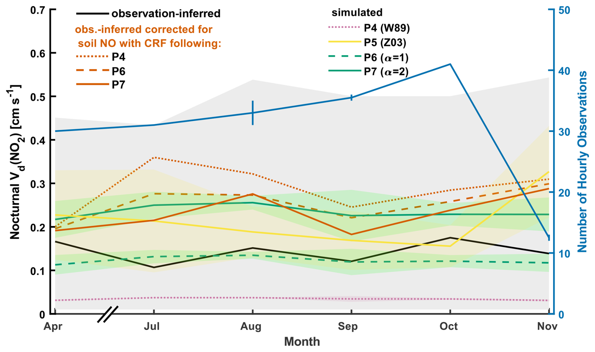 Figure 3 depicts monthly nocturnal Vd(NO2) inferred from Eq. (6) over the HFEMS from April to November 2000 alongside coincidently sampled simulated values from parameterizations P4 to P7. Table 4 presents observation-inferred and simulated values of Vd(NO2) aggregated across all months, as well as associated NO2 lifetimes to dry deposition from the 29 m measurement height. We begin the discussion of eddy-covariance-inferred bulk-canopy Vd(NO2) below, followed by discussions in Sect. 3.3.2 of (i) the large low bias in simulated values stemming from the widely used W89 parameterization of surface resistances and (ii) the reduced bias using the Z03 scheme. In Sect. 3.3.3, we evaluate a simple representation of non-stomatal NO2 uptake following Reaction (R1) against eddy-covariance-inferred Vd(NO2).