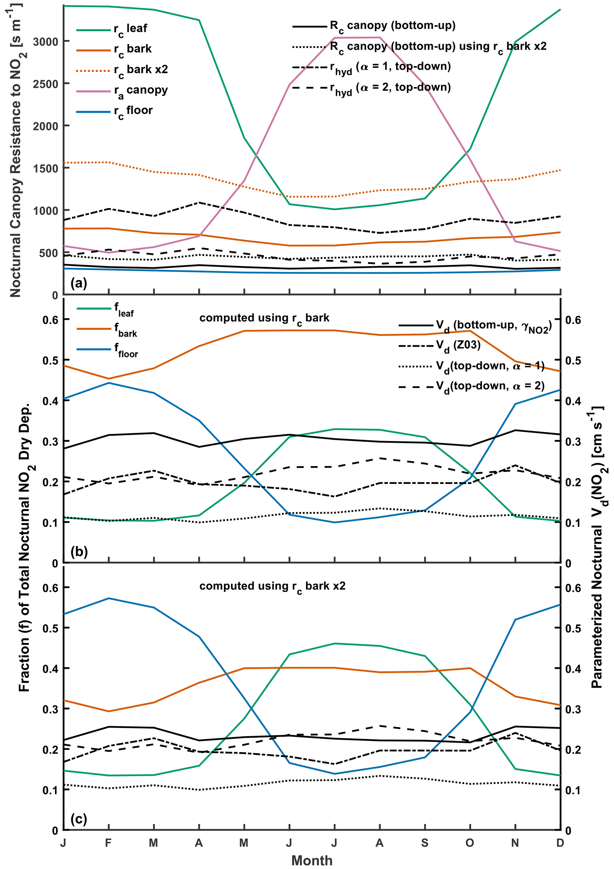Figure 4(a) Computed estimates of monthly mean component canopy resistances for nocturnal NO2 uptake to leaves, bark, and the forest floor at Harvard Forest and the resulting bottom-up bulk-canopy Rc following Eq. (10). Also included are top-down bulk-canopy resistances rhyd following Eq. (8). (b) The resulting bottom-up and top-down canopy-scale nocturnal deposition velocities Vd(NO2), including fractional contributions of leaf, bark, and forest floor surfaces to bottom-up Vd(NO2). Also depicted is nocturnal Vd(NO2) computed following the Z03 parameterization. (c) As in panel (b) but with deposition fractions and bottom-up Vd(NO2) computed with uptake to bark reduced by a factor of 2. Monthly values of resistances, deposition velocities, and meteorological inputs are included in Table S3 in the Supplement. The surface-specific NO2 uptake coefficients used to calculate bottom-up Rc are included in Table 1.