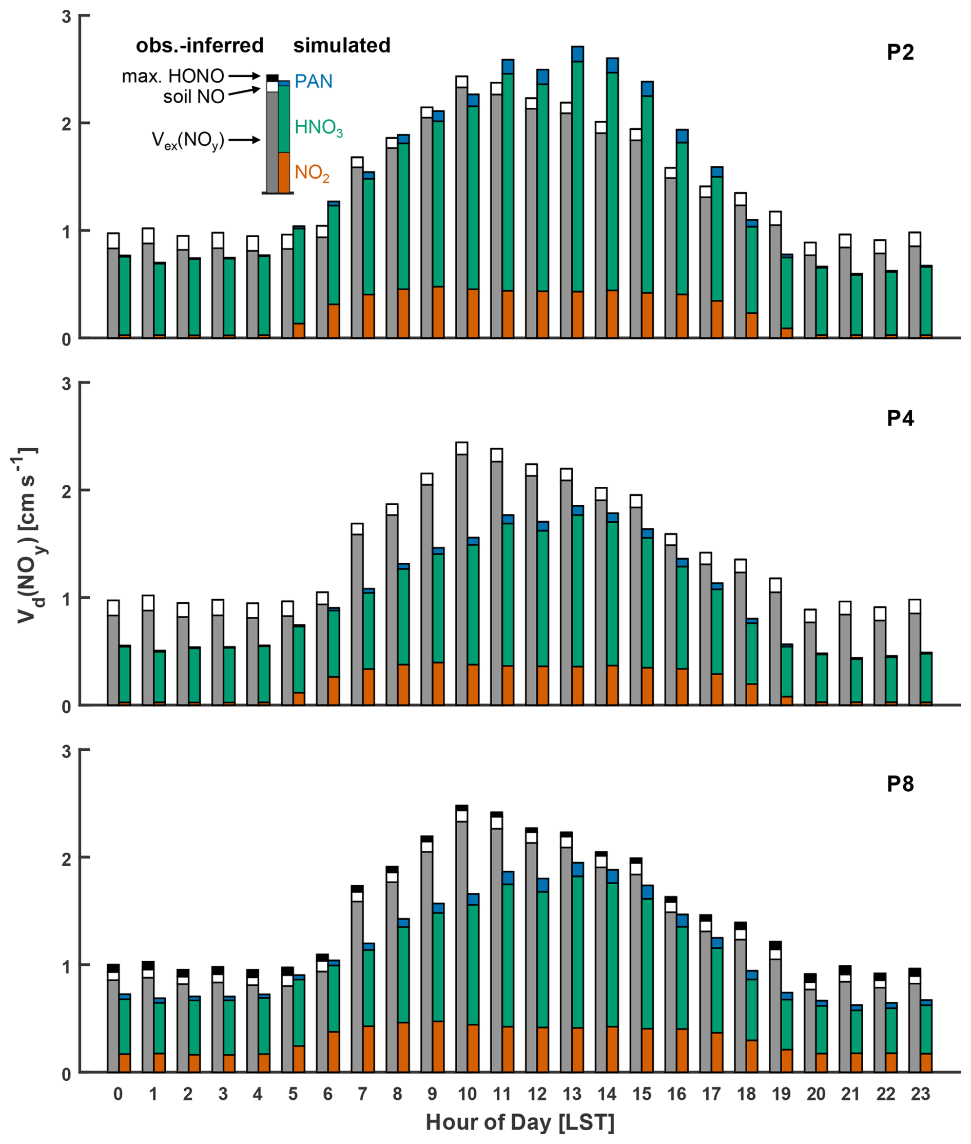 Diel profiles of the simulated Vd(x) used in Eq. (11) to compute simulated Vd(NOy) are depicted in Fig. S4 and reviewed in Sect. S5 in the Supplement. Given the predominant contributions that NO2 and HNO3 make to the NOy budget at Harvard Forest (Fig. 5), updates to the parameterization of Vd(NO2) and Vd(HNO3) discussed in previous sections will have a notable impact on simulated Vd(NOy).