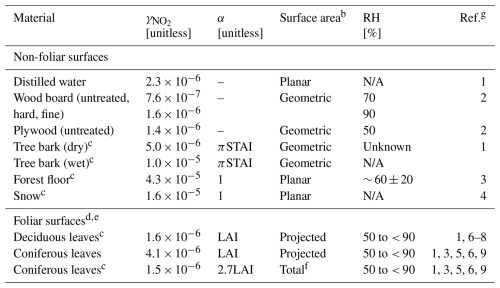 where in-canopy aerodynamic resistance ra was computed according to the Z03 scheme. Component canopy surface resistances in Eq. (10) were computed at an hourly resolution following Eq. (8) using the surface-specific NO2 uptake coefficients from Table 1. Component surface area scale factors α are material dependent, varying according to the surface area used to normalize the deposition fluxes in corresponding measurement studies (Tables 1 and S2). Attention must be paid to the corresponding surface area over which a particular uptake coefficient is to be applied and to the understanding that application of an uptake coefficient for a complex surface where planar or simple estimates of geometric surface areas were used during measurement (i.e., forest floor, snow, or bark) assumes surface area equivalence in subsequent applications. As seen in Table 1, uptake of NO2 to coniferous foliage under conditions of minimal stomatal aperture and RH < 90 % was found to be ∼ 2.6 times greater than to deciduous leaves on a projected area basis. In addition to the greater total-to-projected surface area of coniferous (∼ 2.7) compared to deciduous (∼ 2) leaves, we attribute the reduced non-stomatal uptake of NO2 to deciduous leaves as a consequence of the hydrophobic adaxial (top) surface of deciduous leaves, which lack the elevated water vapor concentrations from stomata to support the thin water films for Reaction (R1) to proceed. We treat the leaves and bark of the forest canopy as wet following the dew flag from the Z03 scheme (Sect. 2.1.2). Under wet conditions, both top and bottom faces of deciduous leaves would be wetted, and we increase the α value used to scale uptake to deciduous leaves from LAI to 2LAI. The α value used to scale uptake to bark is computed as πSTAI, where STAI = 0.9 is the projected area index of tree branches (Horii et al., 2005). We compute forest floor surface resistances rc floor as parallel contributions from uptake to snow and to the snow-free forest floor, weighted by the snow cover fraction following the Z03 scheme (Zhang et al., 2003a). As seen in Table 1, NO2 uptake to wet bark is twice that to dry bark, and uptake to snow is approximately one-third that to the snow-free forest floor.