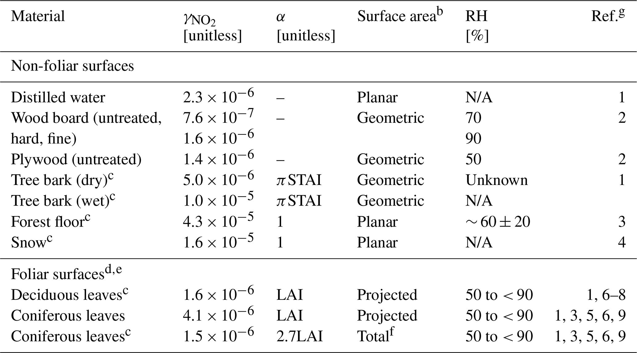 Table 1Surface-specific NO2 uptake coefficients inferred from the literature values of surface-specific deposition velocitiesa following Eq. (4). Also included are surface area scale factors α for which is to be applied and the surface areas and relative humidities over which surface-specific deposition measurements were made.