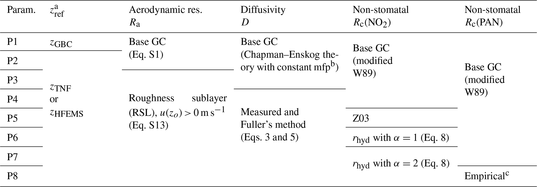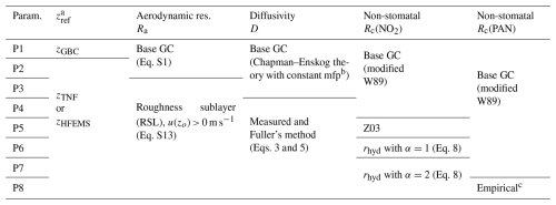 Table 2Modifications to the offline dry-deposition parameterization tested in this study. Parameterization P1 is equivalent to the gaseous dry-deposition scheme in GEOS-Chem (GC). Modifications to P1 include changes to reference height zref (P2), to the formulation of aerodynamic resistance Ra (P3), to molecular diffusivity D (P4), and to non-stomatal surface resistances Rc for NO2 (P5–P7) and PAN (P8).