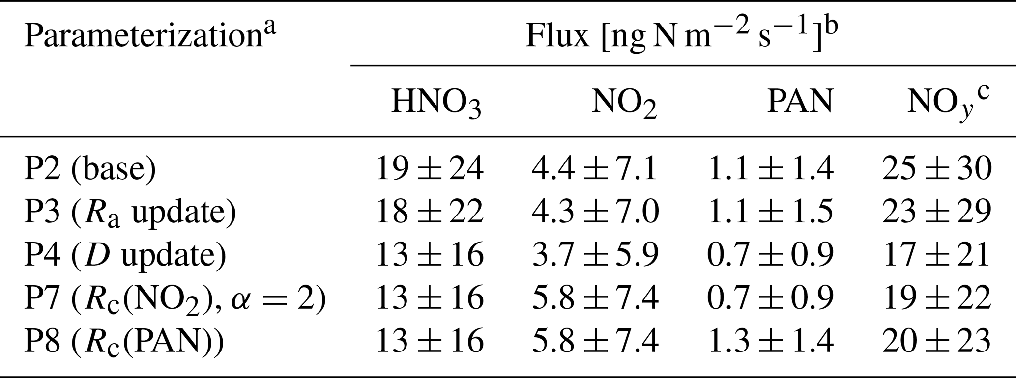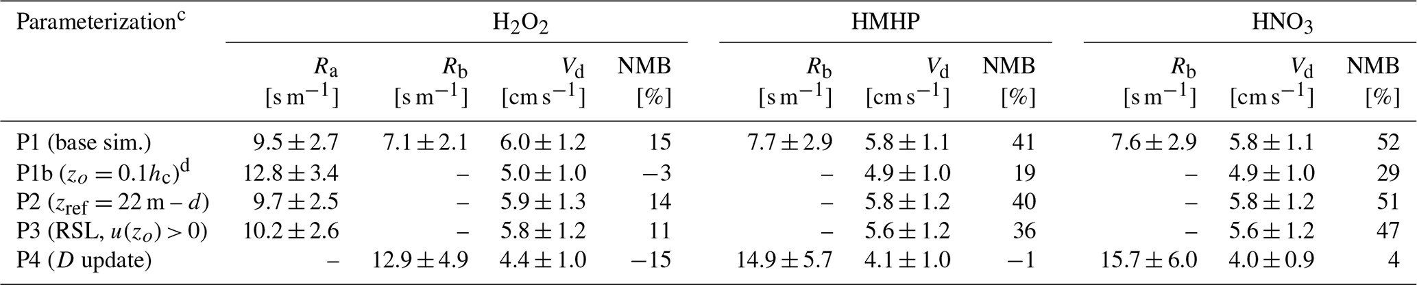 Table 3Effects of updates to the calculation of aerodynamic resistance (Ra) and quasi-laminar sublayer resistance (Rb) on simulated daytime (10:00–15:00 LT) dry-deposition velocities (Vd) over Talladega National Forest (temperate, mixed) for three rapidly depositing species. Serial modifications to the base parameterization P1 are highlighted, i.e., PX (update). Shown are the mean quantities ± standard deviations about the hourly time seriesa and the normalized mean bias (NMB) between simulated and measuredb Vd.