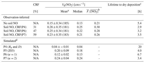 Table 4Nocturnal (20:00–04:00 LST) NO2 deposition velocities over Harvard Forest aggregated from April to November. Observation-inferred values with and without estimated soil NO corrections using simulated canopy reduction factors (CRFs) corresponding to parameterizations P4, P6, and P7 are shown along with coincidently sampled simulated values. Measurements under conditions of low turbulence (friction velocity u∗ < 0.2 m s−1) were excluded from the analysis, leaving 230 hourly observations in the time series (Sect. 2.2.2).