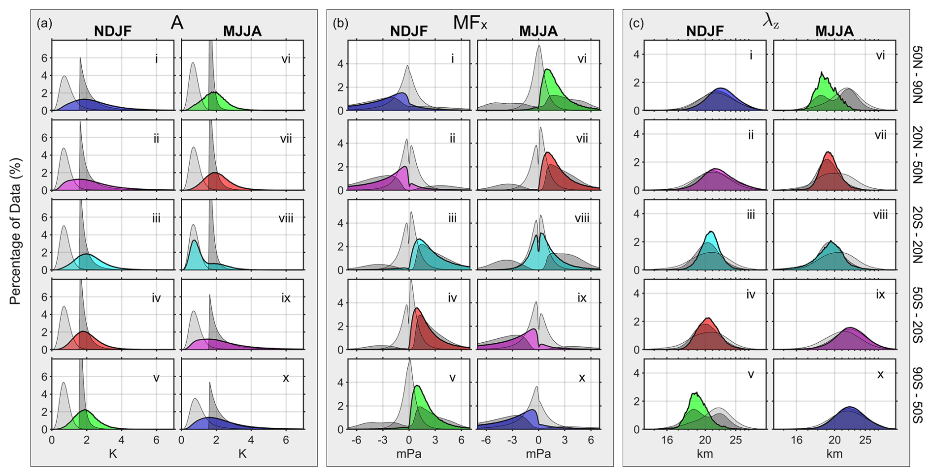 Each variable presented in Fig. 4 exhibits meridional changes (e.g. b.i–v) in the GWs detected using the neighbourhood method. This is equivalent to seasonal changes throughout the year. We hypothesise that this is due to the changing winds beneath the observation altitude (39 km) and the sources of GWs changing meridionally. These changes are seen as a movement of the curve's peak, or as a change in the curve's width. We individually discuss the three variables: amplitude, zonal momentum flux, and vertical wavelength.
