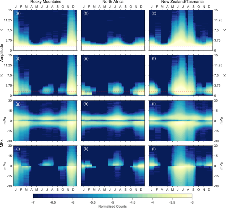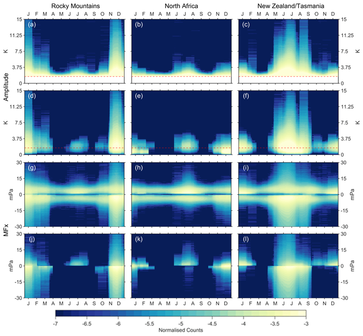 Figure 6Histograms of normalised counts per day of the year (2010–2014), with a monthly-moving mean applied for each day, over the three regions: the Rocky Mountains (a, d, g, j), North Africa (b, e, h, k), and New Zealand/Tasmania (c, f, i, l) of amplitude (a–f) and zonal momentum flux (g–l). Panels (a)–(c) and (g)–(i) present the values of waves detected using the amplitude cutoff method, and panels (d)–(f) and (j)–(l) present the values of waves detected using the neighbourhood method. All waves are detected at 39 km. Colours are on a log10 scale, and have been normalised to sum to one. The red lines on panels (a)–(f) indicate the amplitude cutoff used.