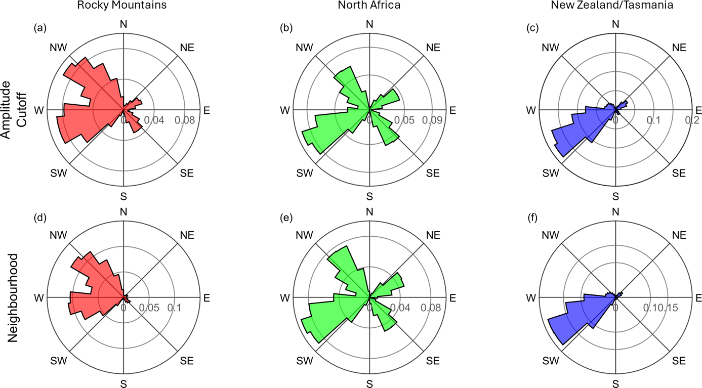 The tight spacing between the most south-westward waves for panel (f) (New Zealand/Tasmania) indicates that these waves propagate into the wind. This agrees with the findings of Smith et al. (2016), Jiang et al. (2019) and Pautet et al. (2019), whose results found that most GWs from New Zealand and Tasmania travel upwind, with wavefronts nearly perpendicular to the Southern Alps. Using ERA5 climatological reanalysis data, we found that the winds in this region during this period are directed north-eastwards, which agrees with these results. These findings can be seen when using the amplitude cutoff method (panel c), but with a tighter spread of results than those found using the neighbourhood method.