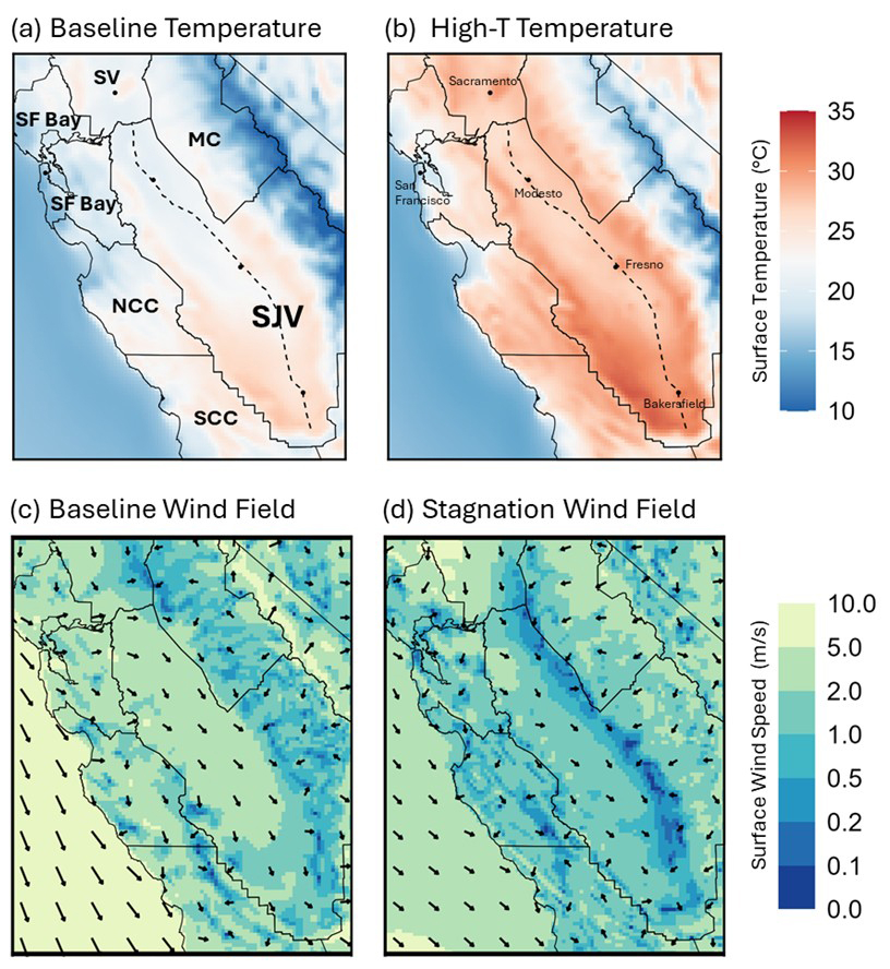 Figure 1Daily average surface temperature (a–b) and wind fields (c–d). Air basins labeled in panel (a) include San Joaquin Valley (SJV), San Francisco Bay area (SF Bay), Sacramento Valley (SV), Mountain Counties (MC), North Central Coast (NCC) and South Central Coast (SCC). Major cities are shown in panel (b), with the dashed line representing Highway 99.