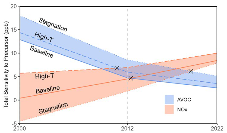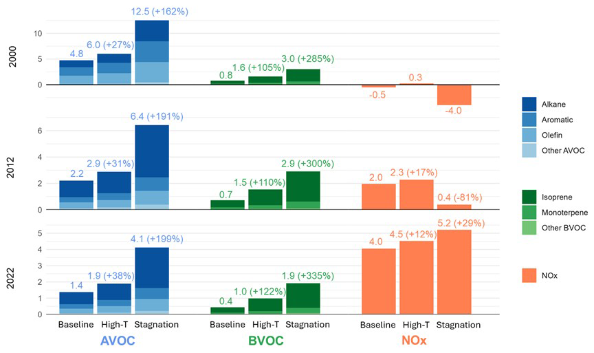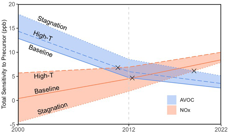 Although the direction of this shift toward a NOx-limited regime is consistent across meteorological scenarios, the timing of this regime switch (cross marks in Fig. 2) can be accelerated or delayed depending on meteorology. Taking the 2012 case as an example, NOx contribution has dominated under high-T conditions, but AVOC contribution is still 4.5 times NOx contribution under stagnation. This finding has important implications for other regions, especially those near the transition point, suggesting that episodic meteorological variability can substantially alter the chemical regime and is an essential consideration for designing robust mitigation strategies.