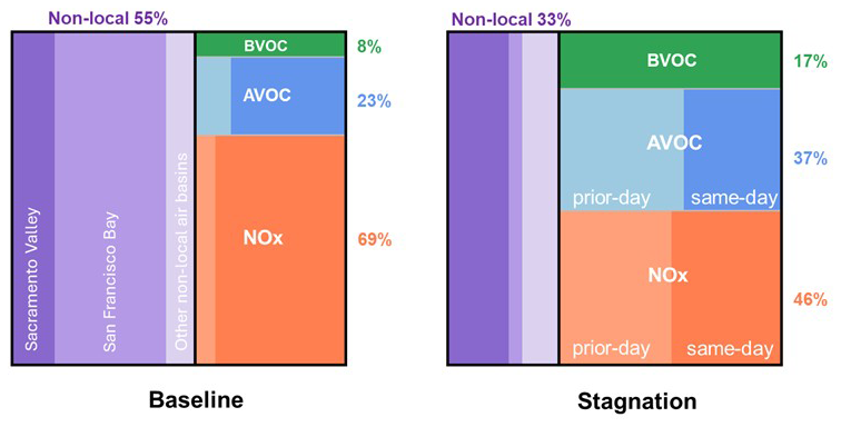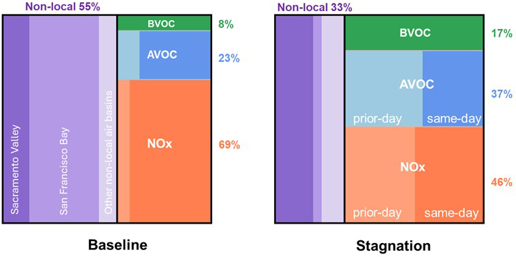 Figure 5Source contributions to SJV Ox under baseline (left) and stagnant (right) conditions for 2022. Each panel shows the relative contributions from non-local sources (purple), as well as local BVOC (green), AVOC (blue) and NOx (orange) sources within the SJV. Local AVOC and NOx sensitivities are further attributed to same-day (darker shading) versus prior-day (lighter shading) emissions.