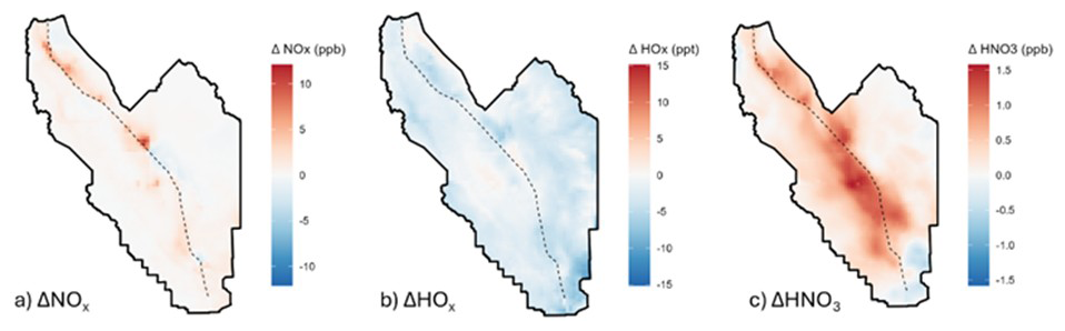 Figure 6Changes in (a) NOx, (b) HOx and (c) HNO3 concentrations within the SJV under stagnation conditions, relative to baseline, for the 2022 emission scenario.