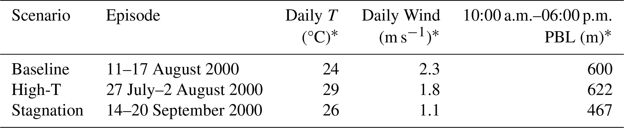 The high-T scenario is characterized by a +5 °C temperature anomaly relative to baseline (Fig. 1b). Its flow patterns and PBL heights resemble the baseline (Figs. S2–S3), although wind speeds are ∼ 20 % slower. This meteorological regime typically corresponds to the presence of a persistent high-pressure ridge over the western U.S., which promotes subsidence, suppresses cloud cover, and results in consecutive days of elevated surface temperatures.