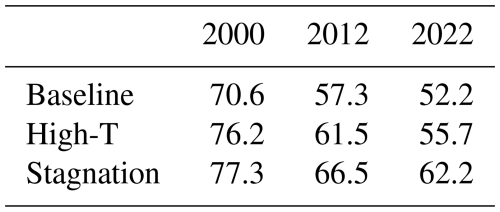 The study domain (Fig. 1) is gridded into 96×117 horizontal grid cells at 4 km resolution with 35 vertical layers. The piecewise parabolic method is used for advection, horizontal diffusion, and eddy vertical diffusion. Chemical reactions are represented using the SAPRC99 mechanism, which includes 72 species and 211 reactions (Carter, 2000). Hourly meteorological inputs for baseline, high-T, and stagnation scenarios are processed from MM5 model outputs (Grell et al., 1994). Time-resolved boundary conditions are derived from the Model for Ozone and Related chemical Tracers (MOZART-4; Emmons et al., 2010). Biogenic emissions are driven by episode-specific meteorological conditions and estimated at hourly resolution using BEIGIS (Scott and Benjamin, 2003). Hourly anthropogenic emissions are provided by the California Air Resources Board for three different years (2000, 2012 and 2022) and are held constant across meteorology. While this approach ensures comparability across scenarios, certain anthropogenic VOC sources, such as evaporative emissions, may also vary with temperature (e.g., Wu et al., 2024), introducing some uncertainty that may affect our results. In our current data, anthropogenic emissions show 45 % and 41 % reductions for NOx and VOC during 2000–2012, and 42 % and 13 % reductions during 2012–2022 (Figs. S5–S6).