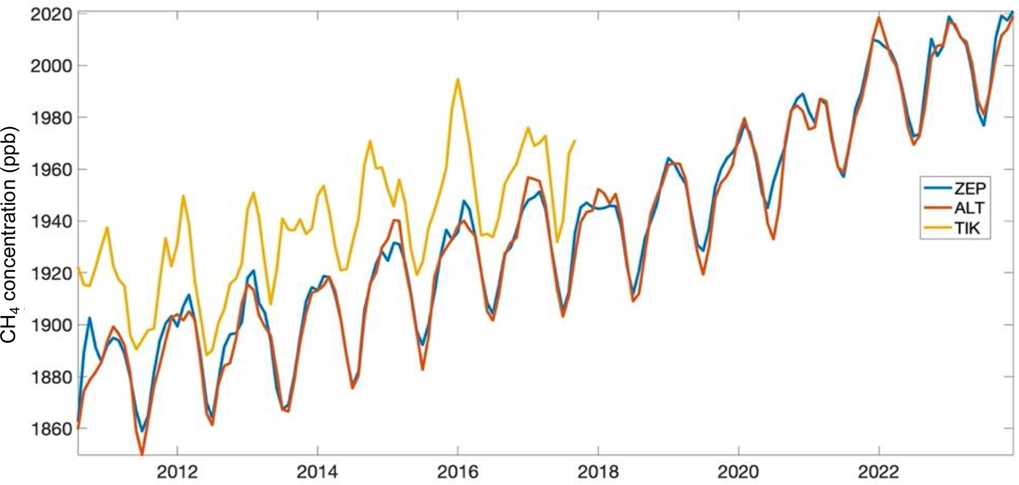 Figure 3Seasonal variations in atmospheric CH4 concentration at three Arctic land stations (Zeppelin, Ny-Alesund, Svalbard, Norway (ZEP), Alert, Nunavut, Canada (ALT) and Hydrometeorological Observatory of Tiksi, Russia (TIK) (period 2011–2018). Data from (Lan et al., 2025).