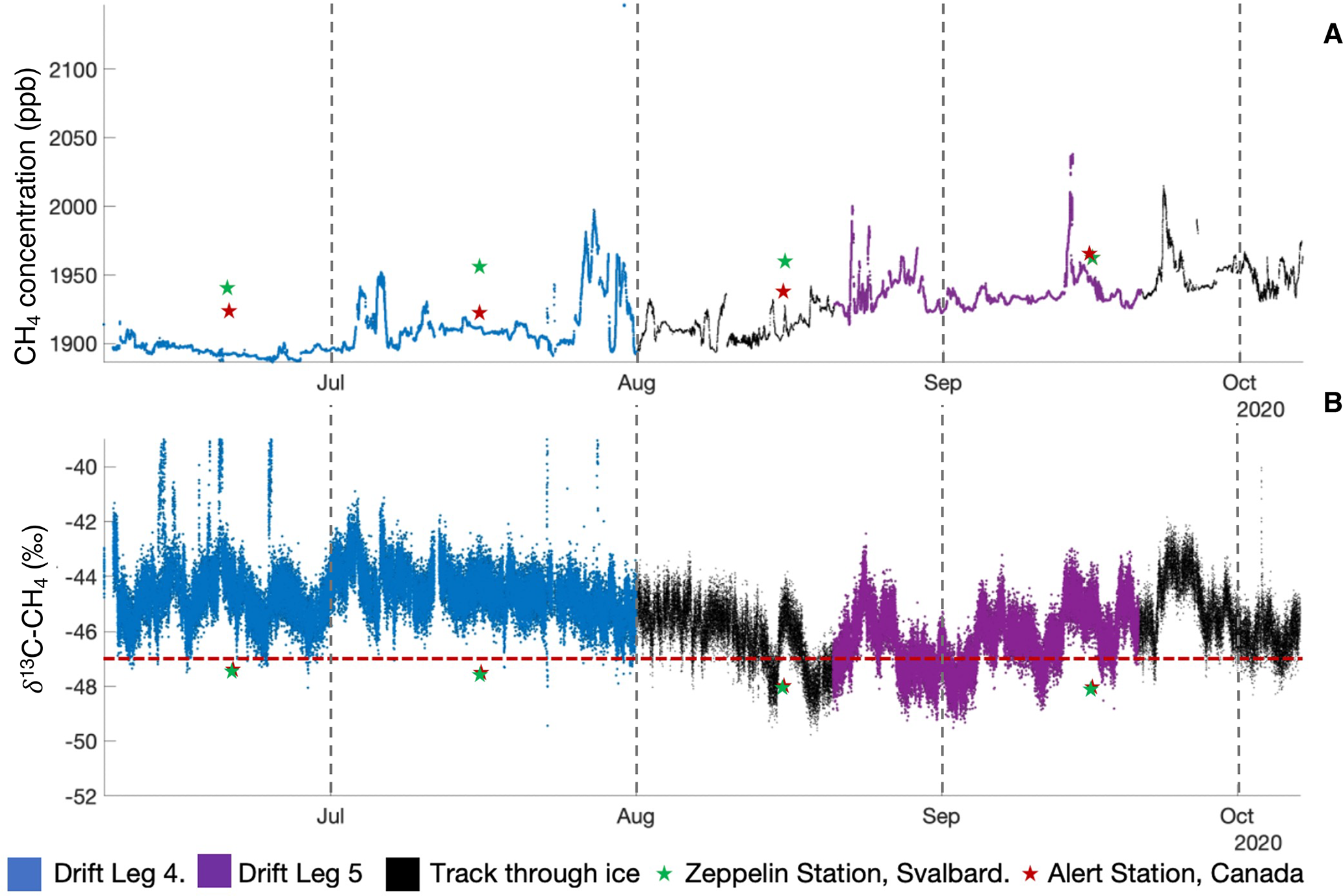 Figure 4Processed ship-borne time series of (A) CH4 concentration and (B) isotopic signature along the track of the RV Polarstern during MOSAiC in the central Arctic. The asterisks indicate the monthly averaged values at Zeppelin Station, Svalbard (green), and at Alert Station, Canada (red) (Lan et al., 2025). The red dotted line represents the atmospheric background isotopic signature of −47.4 ‰ (Lan et al., 2025).