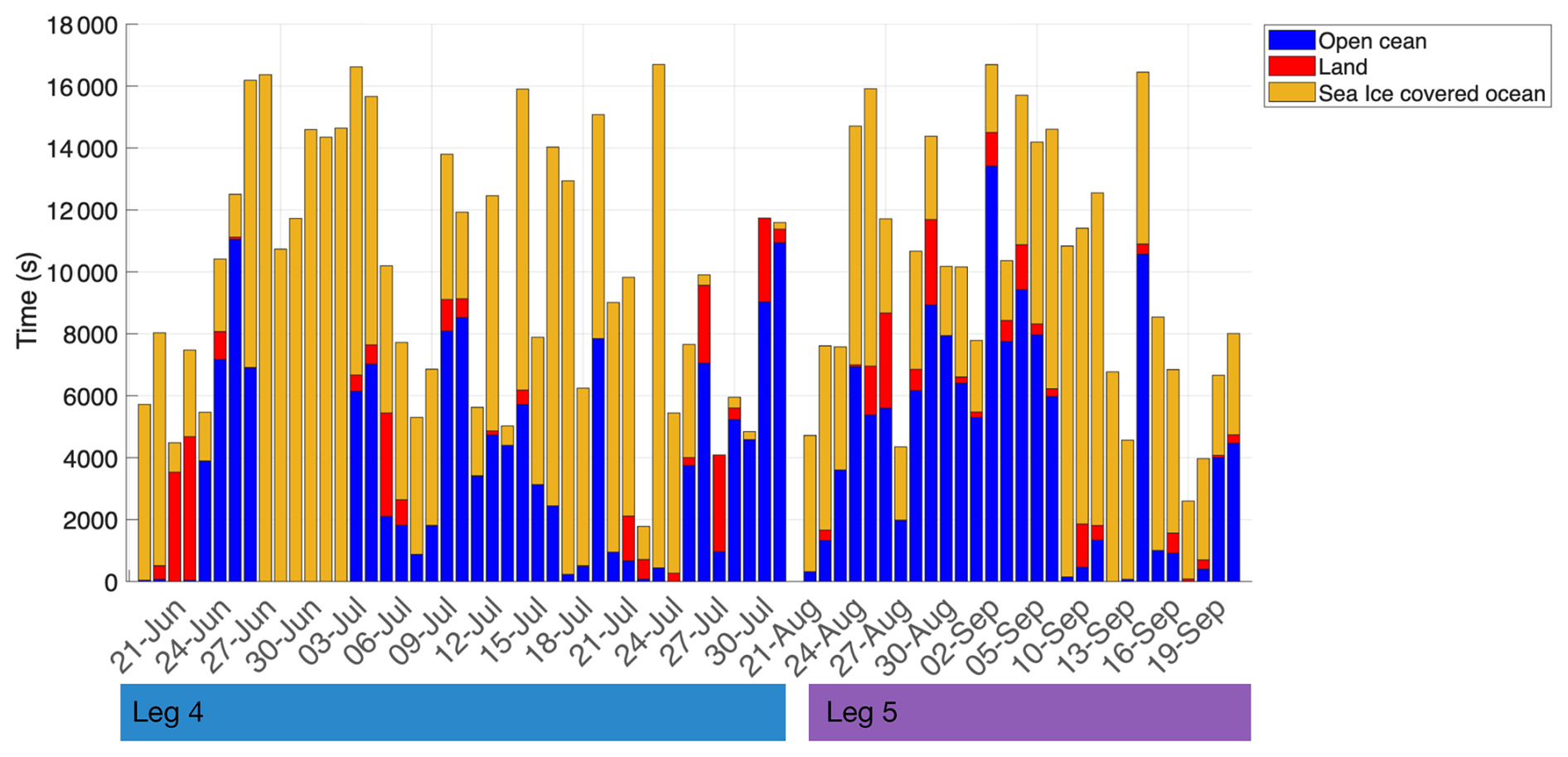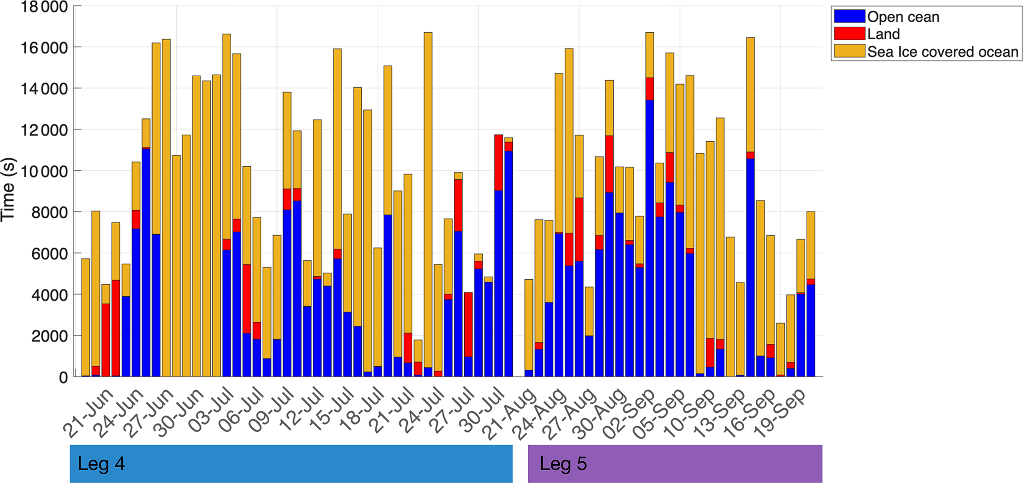 Figure 5Daily air mass backwards trajectories of the drifting periods during Leg 4 and Leg 5 colored in the residence times over land, open and sea-ice covered ocean, respectively. Bar heights indicate the time each trajectory spent within the atmospheric boundary layer.