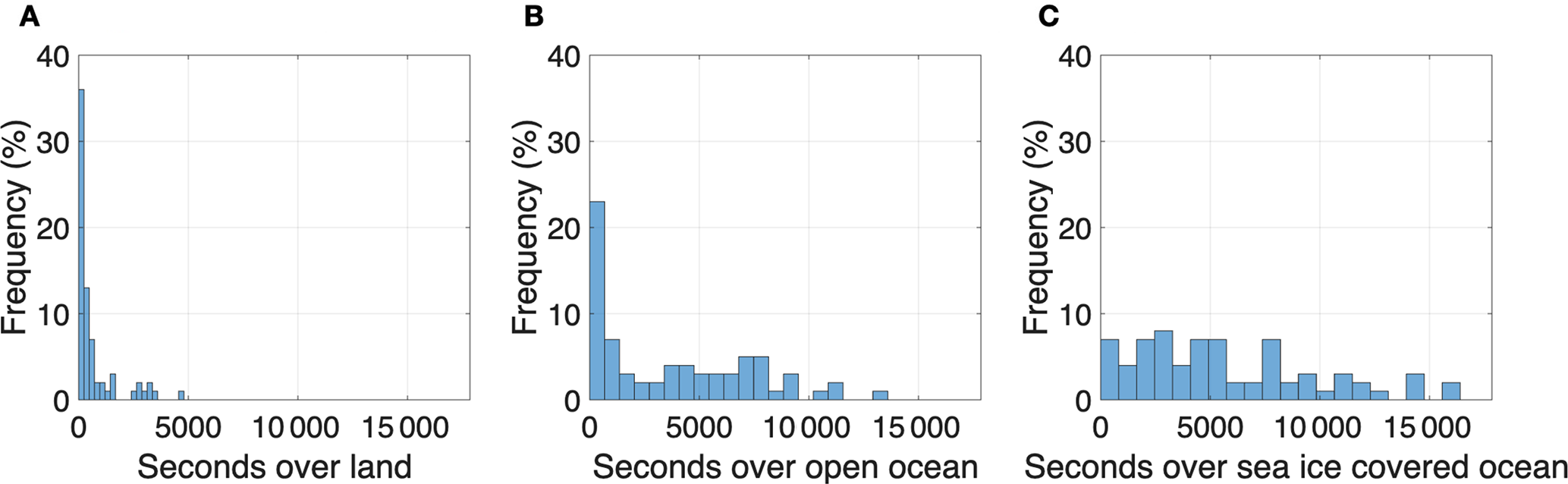 Figure 6The total number of time steps time over land (A), open (B) and sea-ice covered ocean (C), respectively, correlated to the frequency of the daily air mass backwards trajectory during Leg 4 and Leg 5.