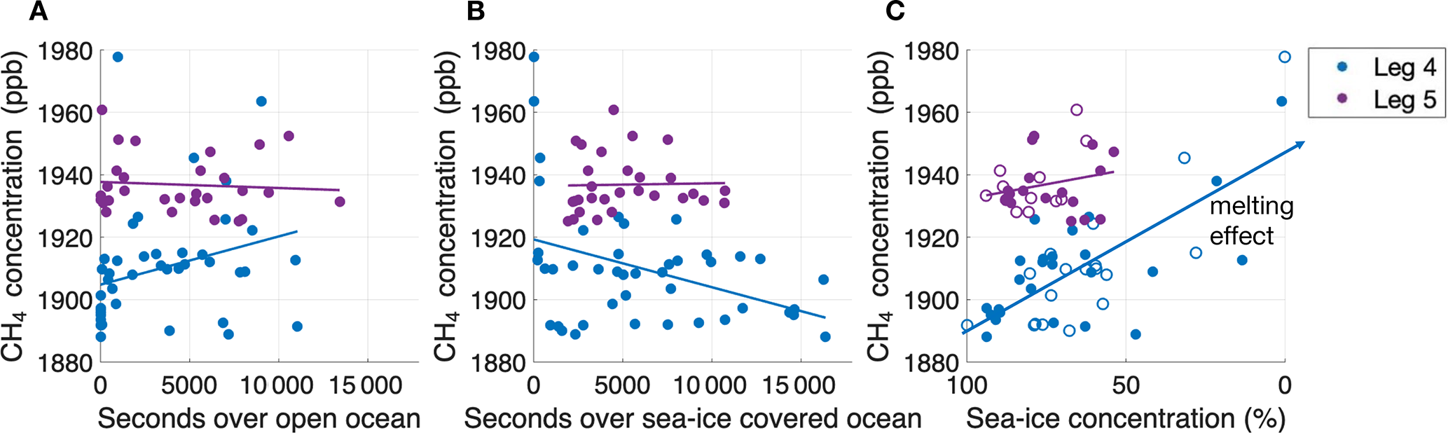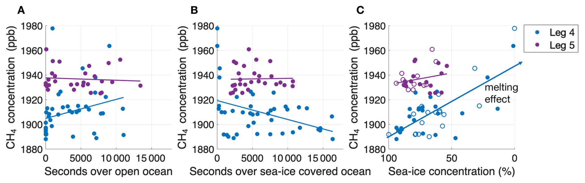 In the next step we linked surface-specific residence times over marine regions with recorded methane variabilities. According to (Angot et al., 2022a). the variability of CH4 concentrations remained relatively small in regions close to the North Pole (Leg 5), (Fig. 7B). Remarkable is the limited variability during long-range atmospheric transport over sea-ice with consistently high concentrations (>50 %) point to a restricted sea-air exchange when the ocean is highly sea-ice covered (Figs. 6 and 7B). By comparison, near the sea-ice edge close to Svalbard (Leg 4) the variability in CH4 concentrations clearly increased locally and with surface-specific residence times (Fig. 7A, B). However, the overall CH4 levels remained lower than those in the central Arctic, with only individual trajectories showing elevated concentrations (Fig. 7). Near the sea-ice edge, air masses predominantly travelled over sea-ice with generally high sea-ice cover (>50 %) as during Leg 5, and just individual trajectories passed over sea-ice with significantly reduced sea-ice concentrations (10 %–40 %) (Fig. 7C). Therefore, on the one hand the variability in air masses consistently passing high sea-ice concentrations is low. On the other hand, the methane variability in air masses encountering reduced sea-ice cover may be influenced by ice melt near the ice edge. Differences in variability between both legs are also shown by (Angot et al., 2022a). Therefore, we postulate that enhanced local methane levels at the ice edge around Svalbard (Leg 4) related to the region close to the north pole (Fig. 4) may be caused by the seawater which is permanently oversaturated with respect to the atmospheric background (Damm et al., 2007; Mau et al., 2017; Silyakova et al., 2022). In addition, methane formerly trapped in sea-ice may also be directly emitted during the early melt season (Kort et al., 2012; Verdugo et al., 2021). Hence, the increased variability reflects the impact of both, the ice melt and regional differences along certain trajectories. We further examined whether the fraction of time that the air mass trajectories spent below the boundary layer height influenced the observed concentration variability (Fig. 7C). However, given the limited dataset, the results suggest that regional effects exert a stronger influence. A higher data resolution, including all-seasons observations, is needed to reveal how processes coupled to the sea-ice cycle affect variations of the atmospheric methane levels in the Arctic.