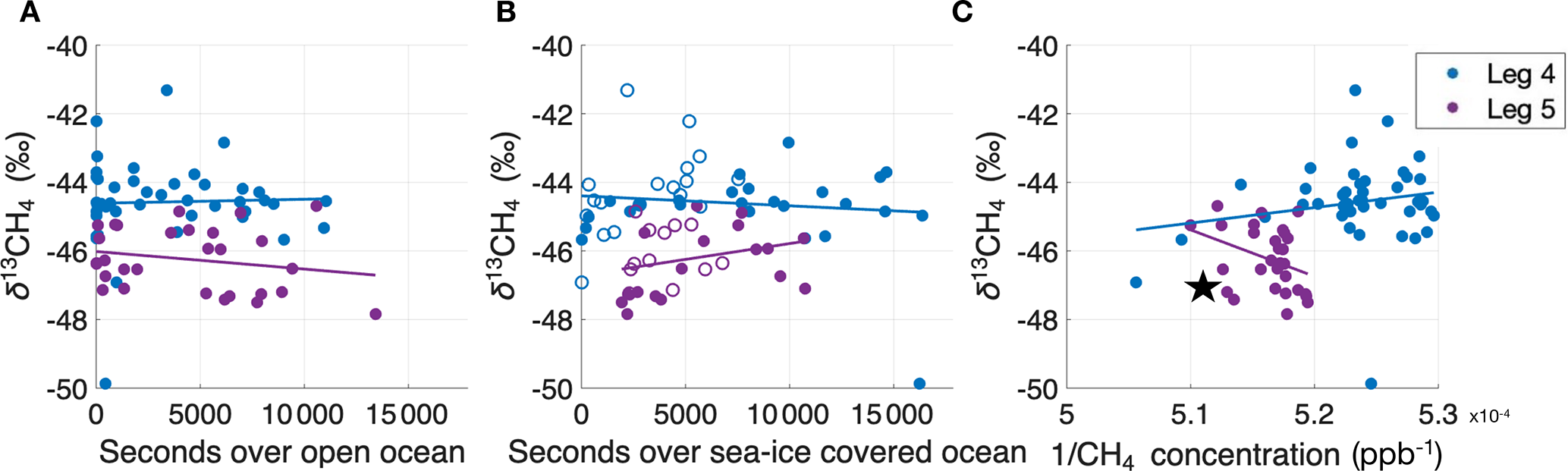 Figure 8Residence time over open (A) and sea-ice covered ocean (B), respectively, correlated to the δ13C-CH4 data during both legs. Filled markers indicate trajectories that remained below the boundary layer height (BLH) for ≥50 % of their total duration, while unfilled markers represent <50 %. C: The inverse of the methane concentration related to the δ13C-CH4 data for both legs. The star indicates the atmospheric background, defined by the average CH4 concentration from nearby land-based stations during the measurement period and an isotopic composition of −47.4 ‰ (Lan et al., 2025).