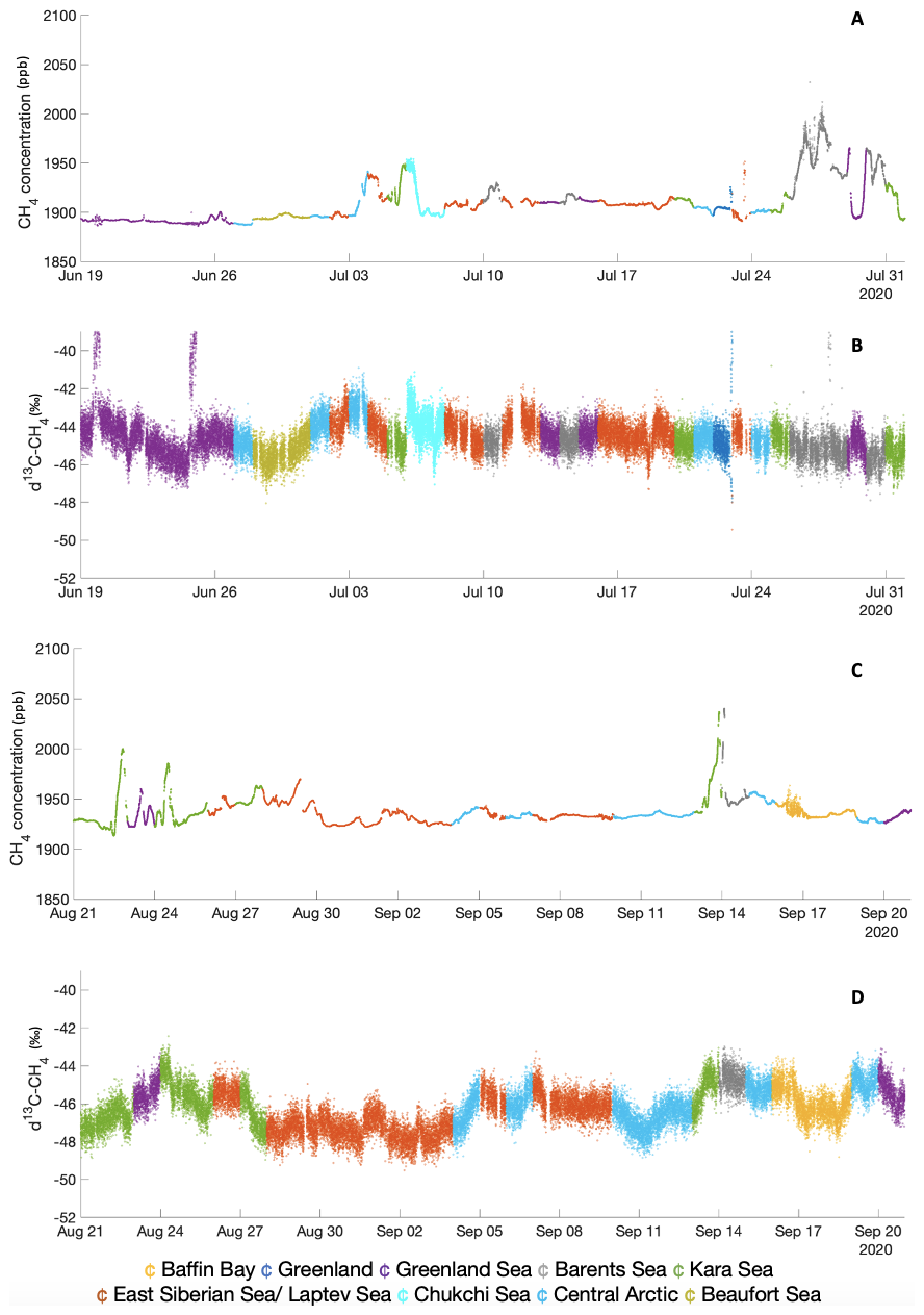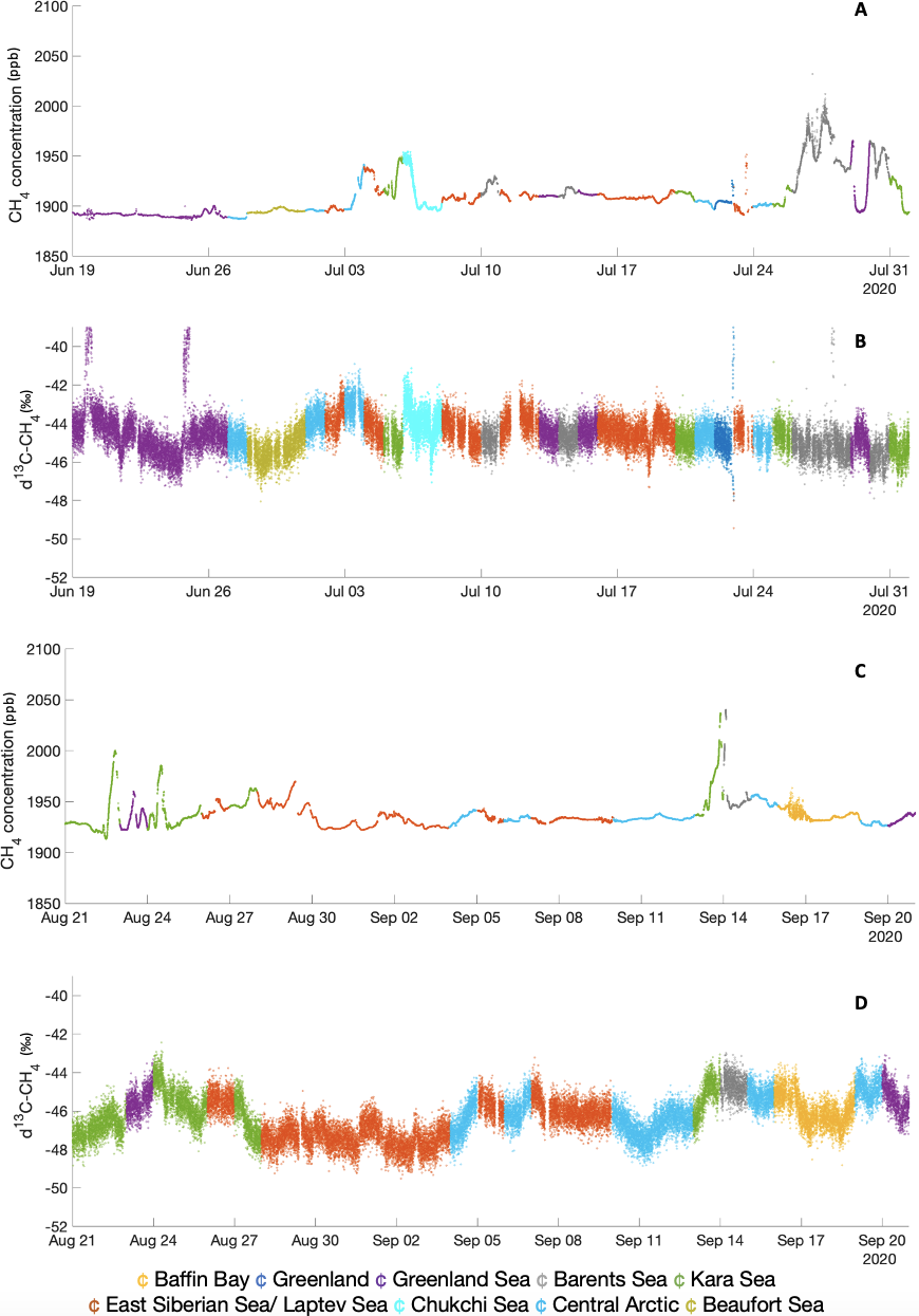 To measure CH4 concentrations and its isotopic composition in air above the Arctic Ocean during Leg 4 (4 June 2020–12 August 2020 with a passive drift in the ice from 19 June 2020–31 July 2020) and Leg 5 (12 August 2020–12 October 2020 with a passive drift in the ice from 21 August 2020–20 September 2020) of the MOSAiC expedition, continuous ship-borne measurements were recorded by Cavity Ring-Down Spectroscopy (CRDS) using a Picarro G2132-i isotope analyser (Picarro, Inc., Santa Clara, USA). Air was drawn in from the starboard side of compass deck of RV Polarstern at about 21 m above the sea-ice/water surface using a Teflon tube with a length of 75 m and an inside diameter of 4.5 mm. A flow rate of 2.4 L min−1 was generated with a 3KQ Diaphragma pump (Boxer, Ottobeuren, Germany). The Picarro G2132-i isotope analyser then continuously measured in the “High Precision” mode with 1 Hz temporal resolution. The time series presented in this study shows good agreement with the temporal variations in CH4 concentration with data presented in Angot et al. (2022a, b), while the absolute values are consistently about 45 ppb lower. A similar offset magnitude is also evident when comparing our data with the weekly flask measurements from (Dlugokencky et al., 2022). Nevertheless, we decided to publish our dataset without applying an additional offset correction, as the instrument was calibrated with two reference gases from the Centre for Isotope Research Groningen University, Netherlands (WMO-X2004 calibration scale). Also, our focus is primarily on regional variability rather than absolute concentration levels. In particular, we are interested in relative variations and their relationship to shifts in the isotopic composition. Notably, the presented time series is the only one that simultaneously captures the stable carbon isotopic signature.