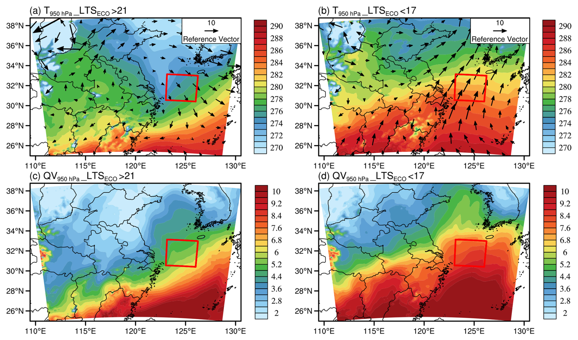 Figure 1The 950 hPa temperature (a–b, in K), wind field (a–b, in m s−1) and water vapor content (c–d, in g m−3) averaged over periods when the LTS in ECO (highlighted by the red box) is high (>21, a,c) and low (<17, b, d), from the Control experiment.