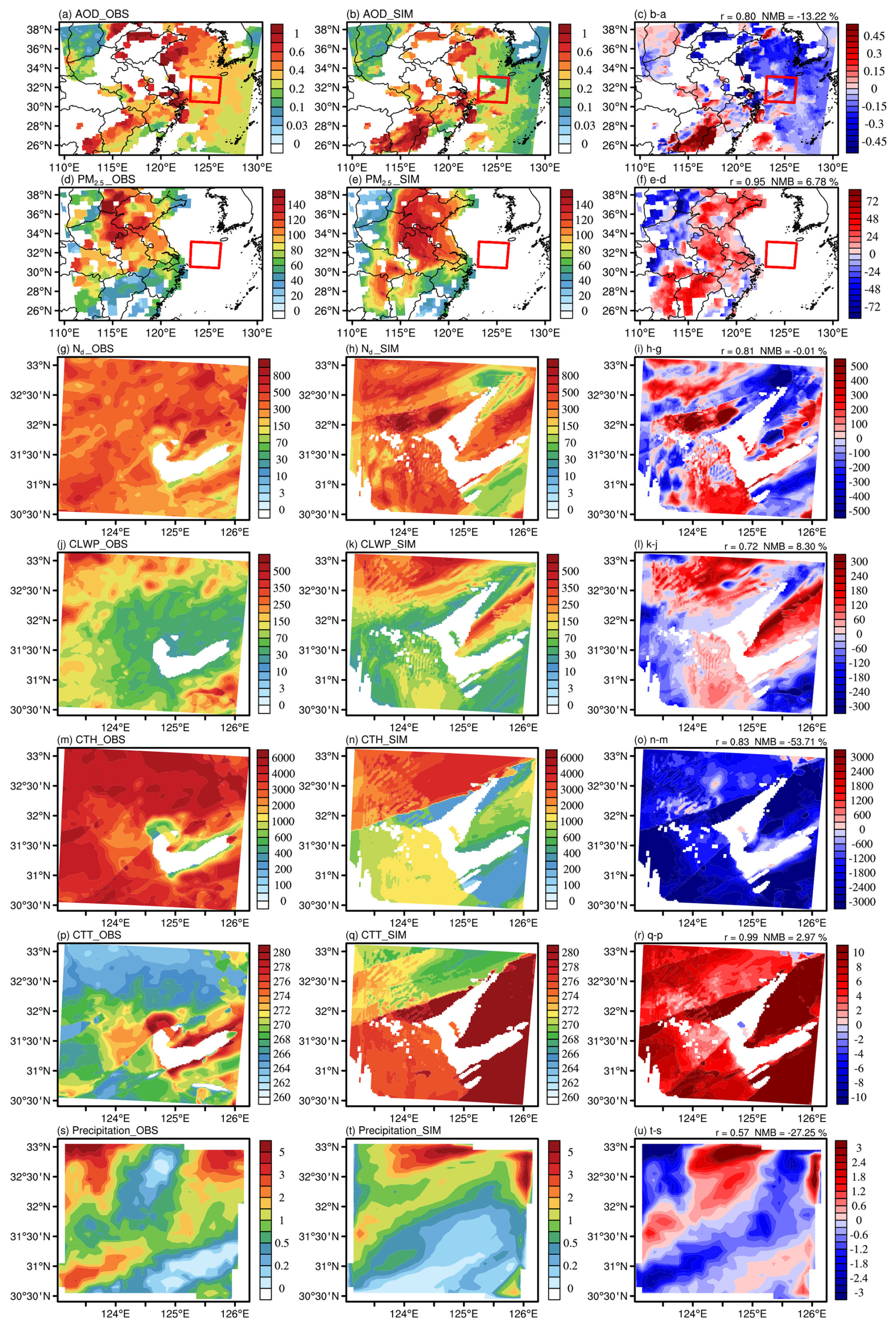 Figure 4Averaged distributions of observed (left column. AOD and cloud properties, near-surface PM2.5, and precipitation from MODIS retrievals, near-surface observations, and IMERG, respectively) and simulated (middle column, from Control experiment) AOD (a–c) and near-surface PM2.5 (d–f, in µg m−3) of the outer domain, and Nd (g–i, in cm−3), CLWP (j–l, in g m−2), CTH (m–o, in m), CTT (p–r, in K), and cumulative precipitation (s–u, in mm, and as the IMERG resolution is 1 d, here is the cumulative precipitation for 2–4 February) of the inner domain (the areas within the red boxes in af), as well as the differences between simulations and observations (right column, r and NMB in the upper right corner represent the spatial correlation coefficient and normalized mean bias between simulation and observation). The simulated data in the figure are processed using interpolation and spatio-temporal matching (the latter is applied only for comparison with satellite-retrieved data exhibiting spatio-temporal discontinuities), as detailed in Sect. 2.4. For each grid cell, the corresponding simulated result is displayed only when observational data is available.