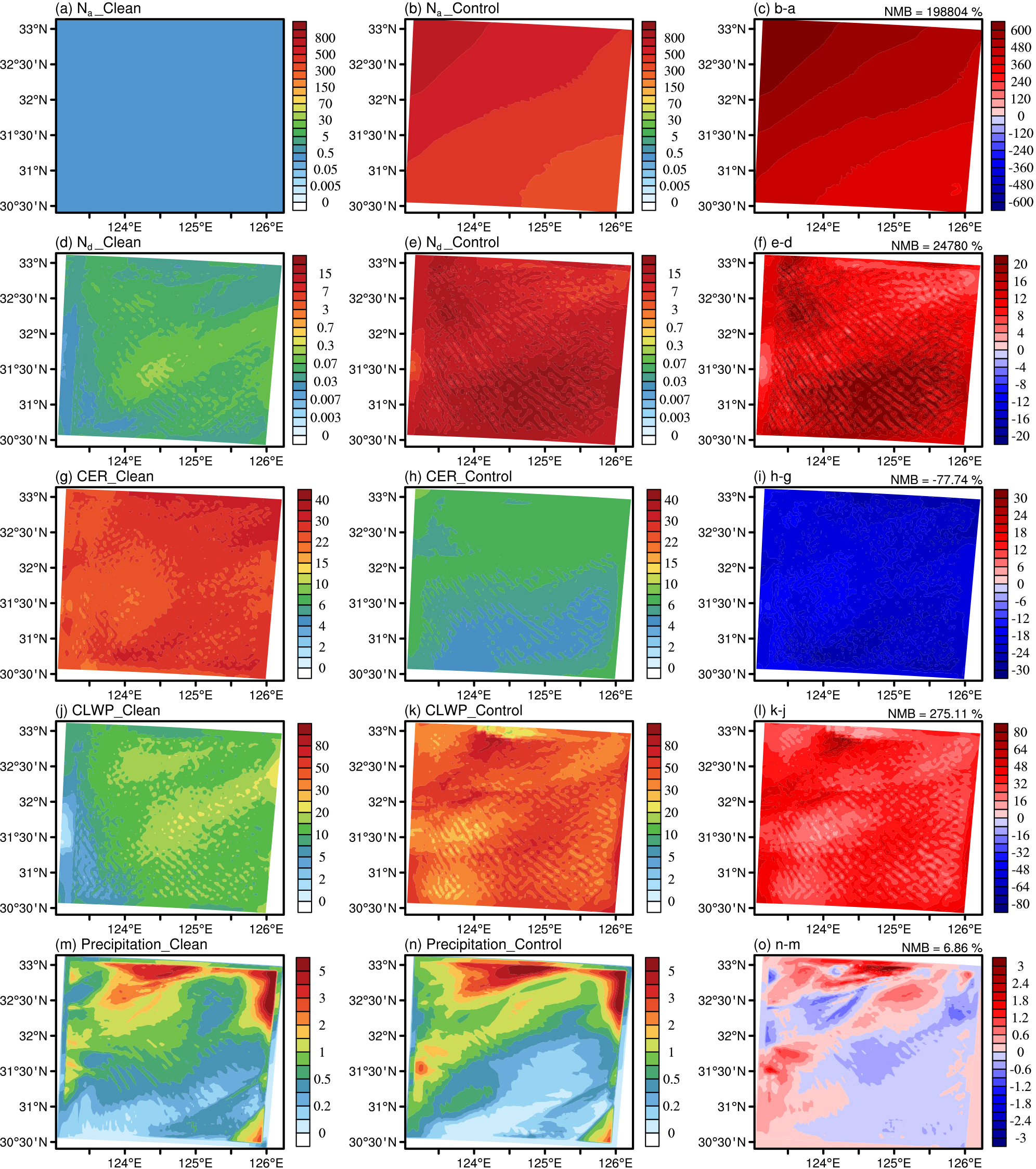 Figure 5Column-mean Na (a–c, in cm−3), in-cloud mean Nd (d–f, in cm−3), CER (g–i, in µm) and CLWP (j–l, in g m−2), and accumulated precipitation (m–o, in mm) averaged over the simulation period from the Clean (left column) and Control (middle column) experiments. The right column shows the differences between the two experiments (Control minus Clean). NMB in the top-right corner of each panel represents the relative change of Control compared to Clean.