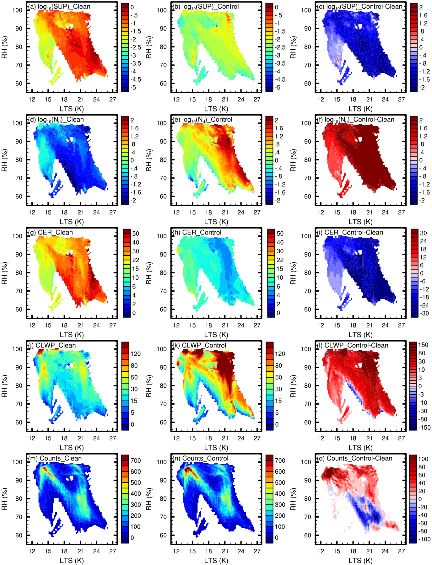 Figure 6In-cloud mean supersaturation (a–c, in %) in base-10 logarithms, Nd (d–f, in cm−3) in base-10 logarithms, CER (g–i, in µm), and CLWP (j–l, in g m−2), as well as the counts of liquid-phase cloud samples (m–o) variations with RH and LTS, are presented for the Clean (left column) and Control (middle column) experiments, along with the difference between them (Control minus Clean, right column) during the simulation period. Supersaturation and RH are column-mean values from the surface to 1300,m. All liquid-phase cloud samples with a CLWP greater than 1 g m−2 and no ice-phase particles throughout the column are included. Samples are binned into 100 × 100 bins based on horizontal and vertical coordinates. To ensure that the differences between the two experiments represent the impact of continental aerosols on the same cloud processes, the binning is performed using the meteorological fields from the Control experiment rather than the respective meteorological fields from each individual experiment. In the figure, counts represent the sum of samples within each bin, while the others represent the average of samples within each bin.