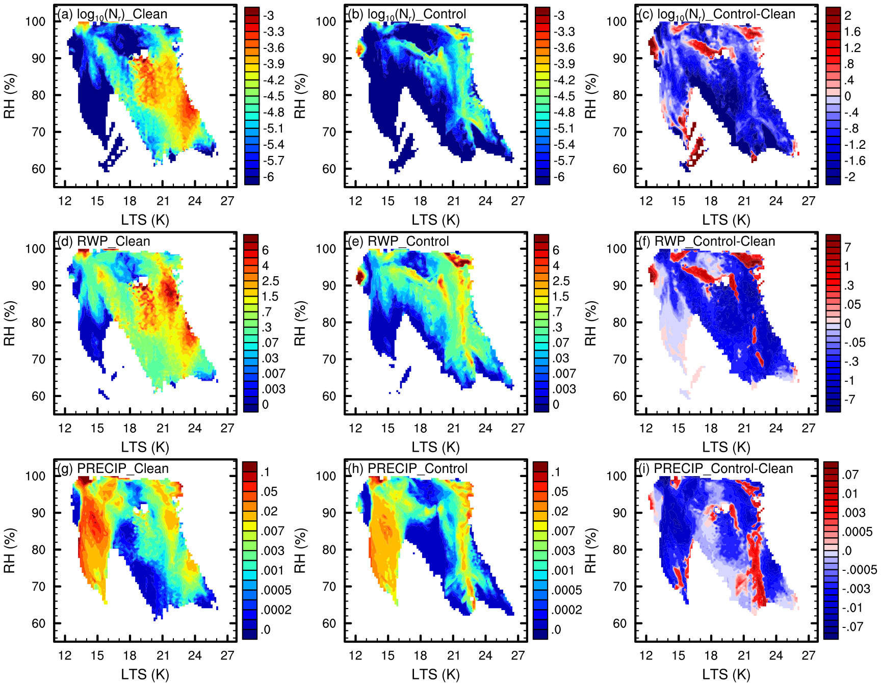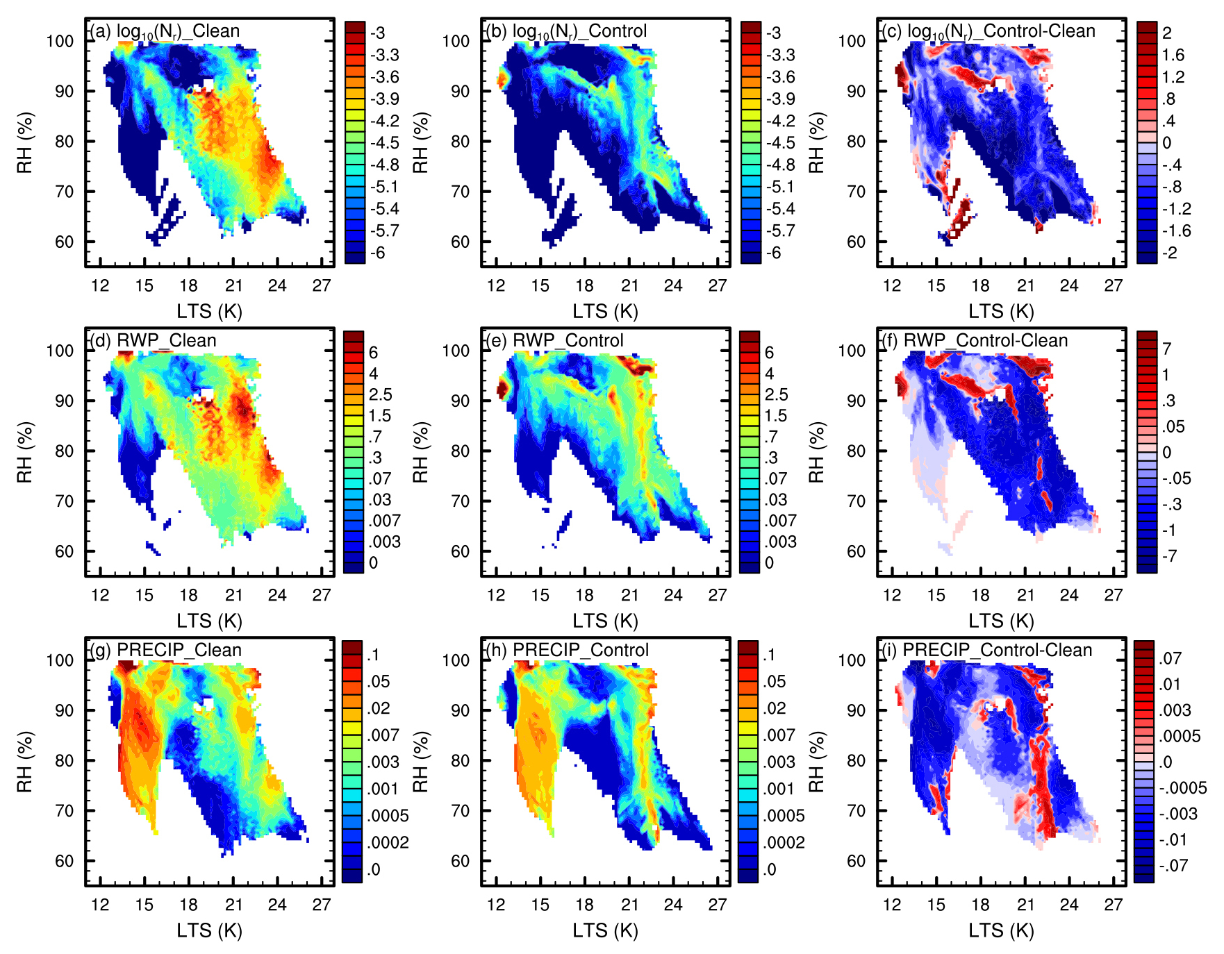 Figure 7In-cloud mean Nr (a–c, in cm−3), RWP (d–f, in g m−2), and hourly precipitation (g–i, in mm h−1) variations with RH and LTS, are presented for the Clean (left column) and Control (middle column) experiments, along with the difference between them (Control minus Clean, right column) during the simulation period. The data processing method is the same as that used in Fig. 6.
