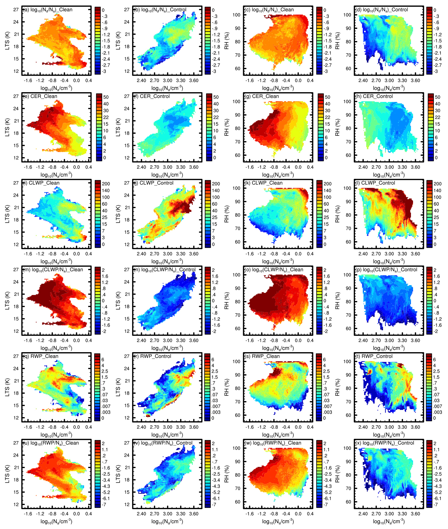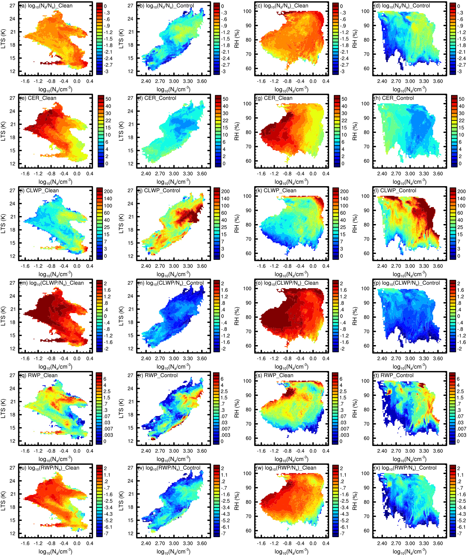 Figure 9Variations of in-cloud mean Nd/Na (a–d, in cm−3 cm3) in base-10 logarithms, CER (e–h, in µm), CLWP (i–l, in g m−2), CLWP /Na (m–p, in g m−2 cm3) in base-10 logarithms, RWP (q–t, in g m−2), and RWP /Na (u–x, in g m−2 cm3) in base-10 logarithms with meteorological conditions (LTS, left two columns, and RH, right two columns) and Na in base-10 logarithms for the Clean (first and third columns) and Control (second and fourth columns) experiments. Except for the use of respective meteorological elements and Na from each experiment during sample binning – to reflect changes specific to each experiment – the data processing method remains consistent with that applied in Fig. 6.