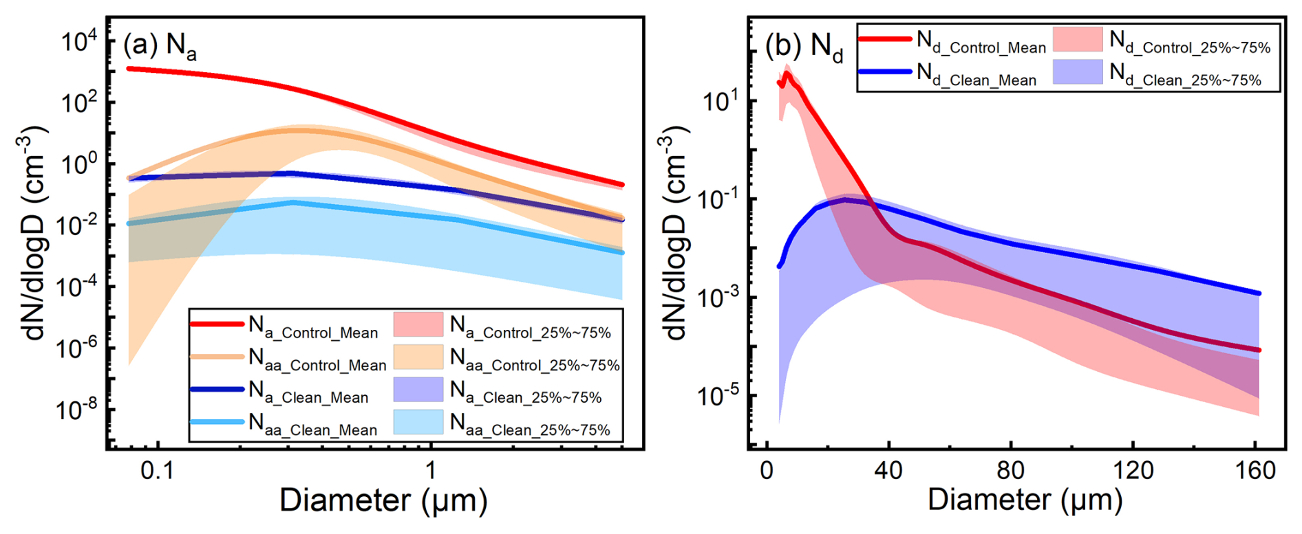 Figure 10In-cloud mean aerosol (a, Na as total aerosol number concentration, Naa as activated aerosol number concentration) and droplet (b) size distribution in the Control and Clean experiments (In WRF-Chem-SBM, each cloud droplet corresponds to an activated aerosol particle, meaning Nd and Naa are equivalent in total quantity. (b) shows the spectral distribution of cloud droplets through the variation of Nd across different bins, while (a) displays the activation efficiency of aerosols by comparing Na and Naa of the four aerosol bins).