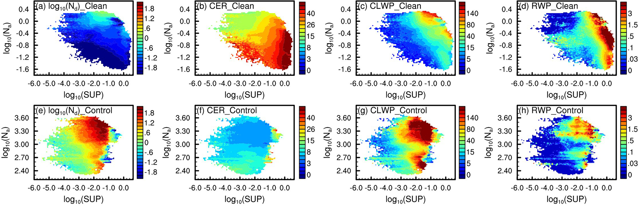 Figure 11Variation of in-cloud mean Nd (a, e, in cm−3) in base-10 logarithms, CER (b, f, in µm), CLWP (c, g, in g m−2), and RWP (d, h, in g m−2) with Na (in cm−3) and supersaturation (SUP, in  %) in base-10 logarithms for the Clean (a–d) and Control (e–h) experiments during the simulation period. The data processing method is the same as that used in Fig. 9.