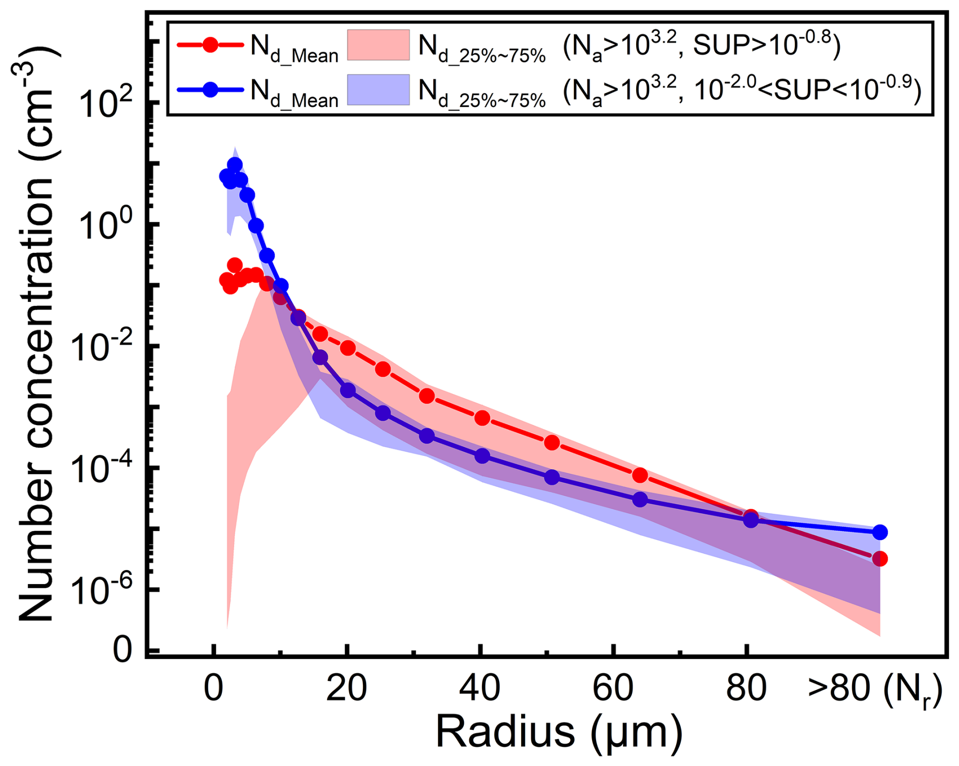 Figure 12Column-mean cloud droplet and raindrop (droplet with a radius greater than 80 µm) spectral distributions (mean and 25th to 75th percentile range) in relatively moderate (10−2.0 to 10−0.9 %, i.e., ∼0.01 to 0.13 %, blue line) and relatively high supersaturation (>10-0.8  %, i.e., >0.16%, red line) environments under high Na (>103.2 cm−3, i.e., >1585 cm−3) during the simulation period.