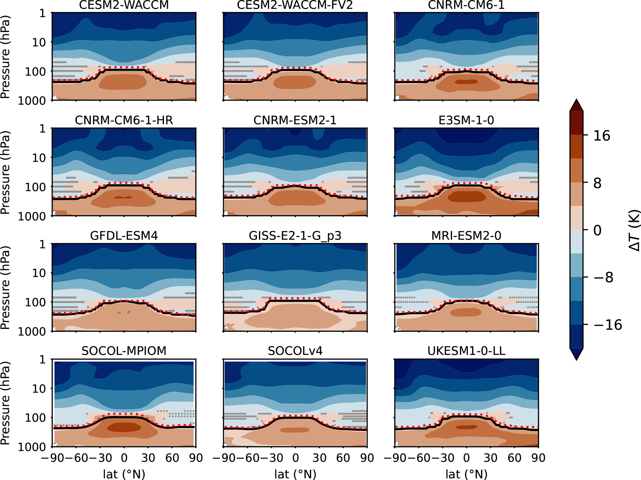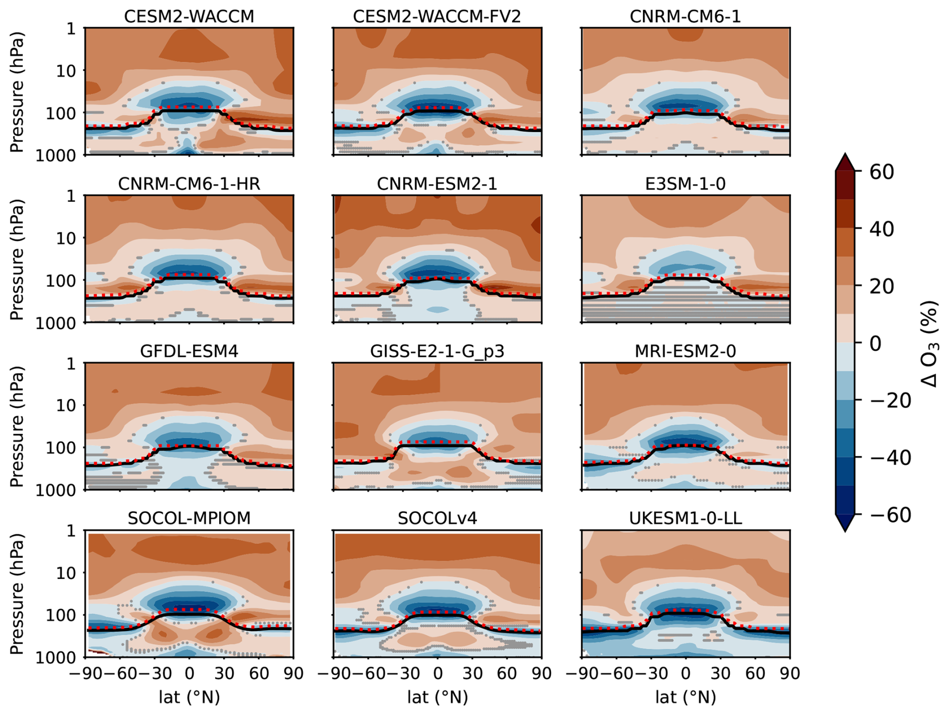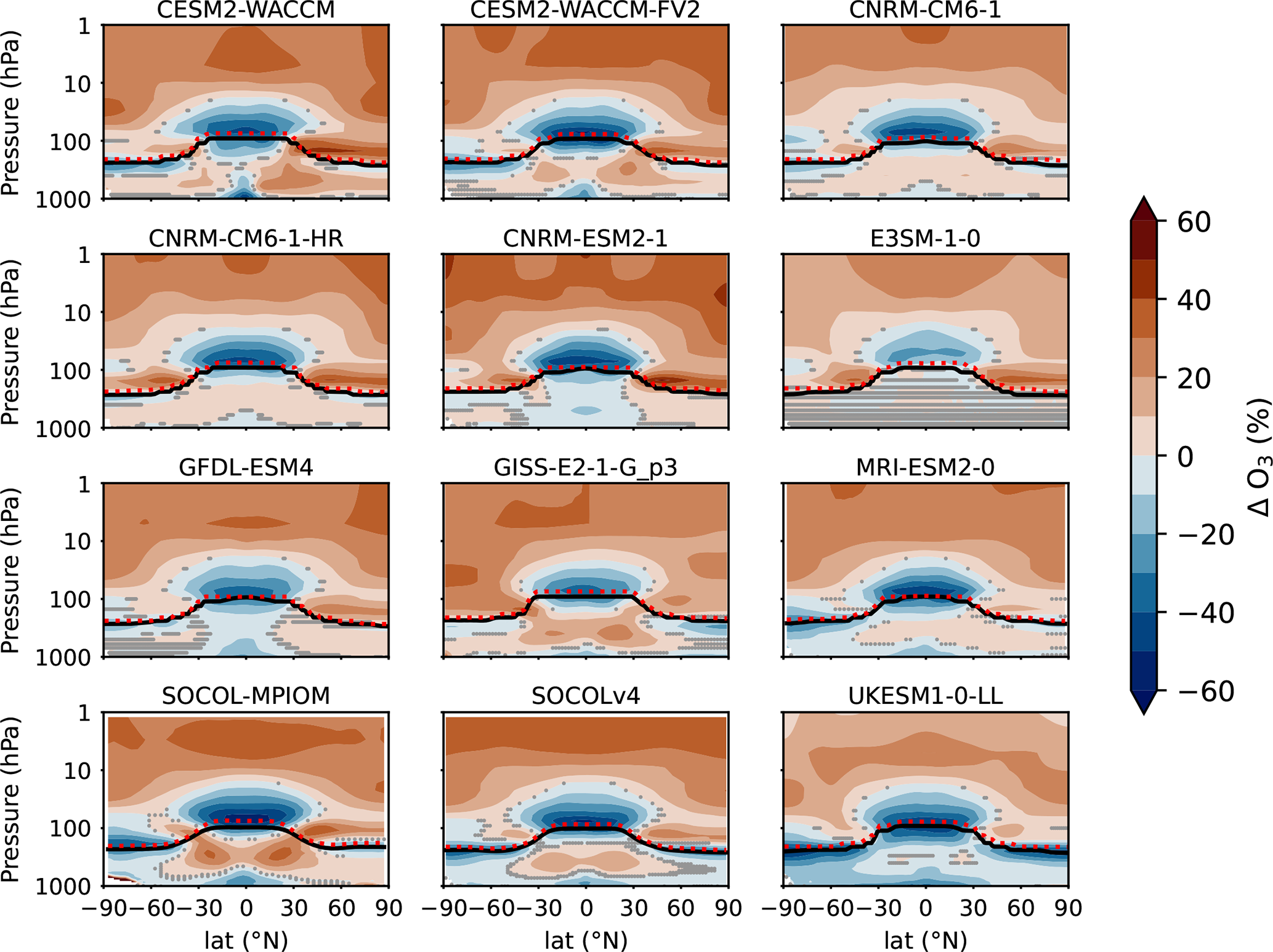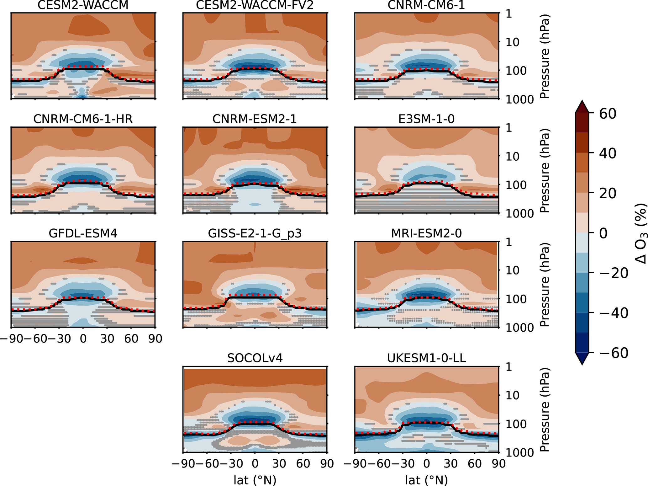 Figure B1Annual-mean ozone response to 1pctCO2 of each chem model. Tropopause for piControl (1pctCO2) is denoted using black (red dotted) curve. Regions that are not stippled are statistically significant (at the 99 % level), according to the t-test.
