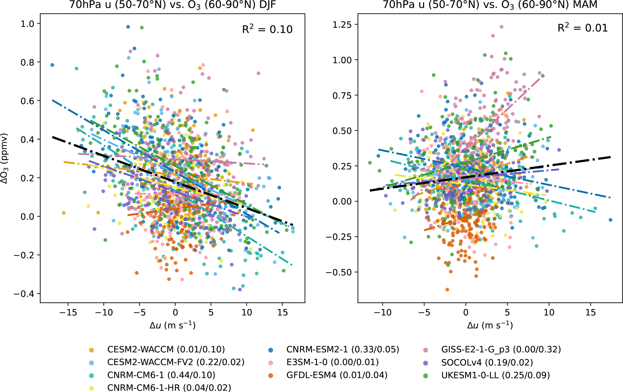 Figure 3150-year-long seasonal-mean ozone response in 60–90° N to zonal wind (u) change in 50–70° N at 70 hPa in DJF and MAM for 1pctCO2. Fitting lines retrieved from linear regression are plotted as dash-dotted lines in the corresponding color for each model. The thick black line is fitted using data from all models with the corresponding R2 denoted in the upper right corner of the plot. R2 values for each model are denoted in the legend for DJF and MAM, respectively.
