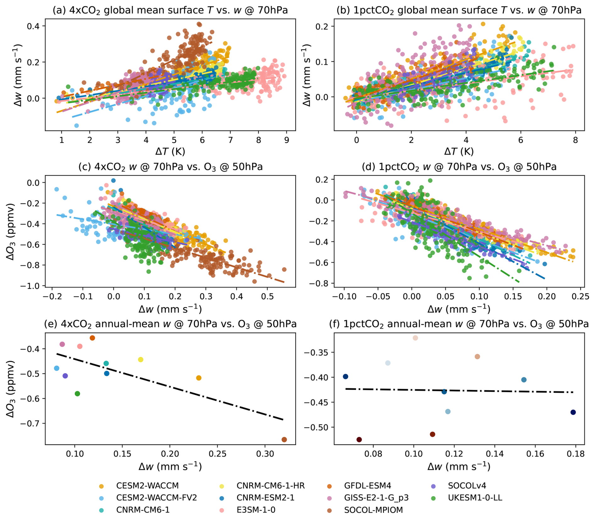 Figure B4(a, b) Annual-mean tropical (15° S–15° N) residual upwelling () response to global mean surface temperature for 4×CO2 and 1pctCO2. (c, d) Annual-mean tropical (15° S–15° N) ozone response at 50 hPa to upwelling (w) change at 70 hPa for 4×CO2 and 1pctCO2. (e, f) Same as (c, d), but averaged over the last 100 years for 4×CO2 and over all the 150 years for the 1pctCO2 experiment. Fitting lines retrieved from linear regression are plotted in the corresponding color for each model.