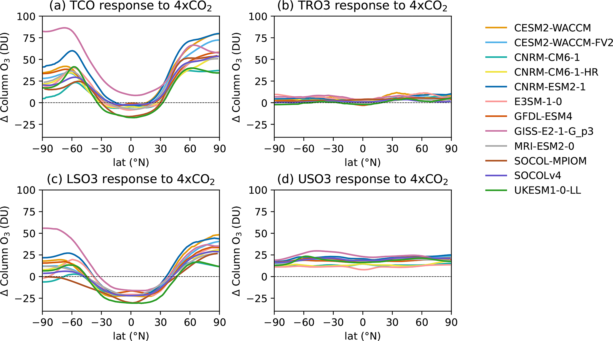 Figure 5Annual-mean column ozone response to 4×CO2 change. (a) TCO, (b) tropospheric (TRO3), (c) lower-stratospheric (LSO3), and (d) upper-stratospheric (USO3) partial ozone columns. The lower stratosphere is defined as the atmospheric layer between the tropopause and 20 hPa, and the upper stratosphere is defined as the layer between 20 and 1 hPa.