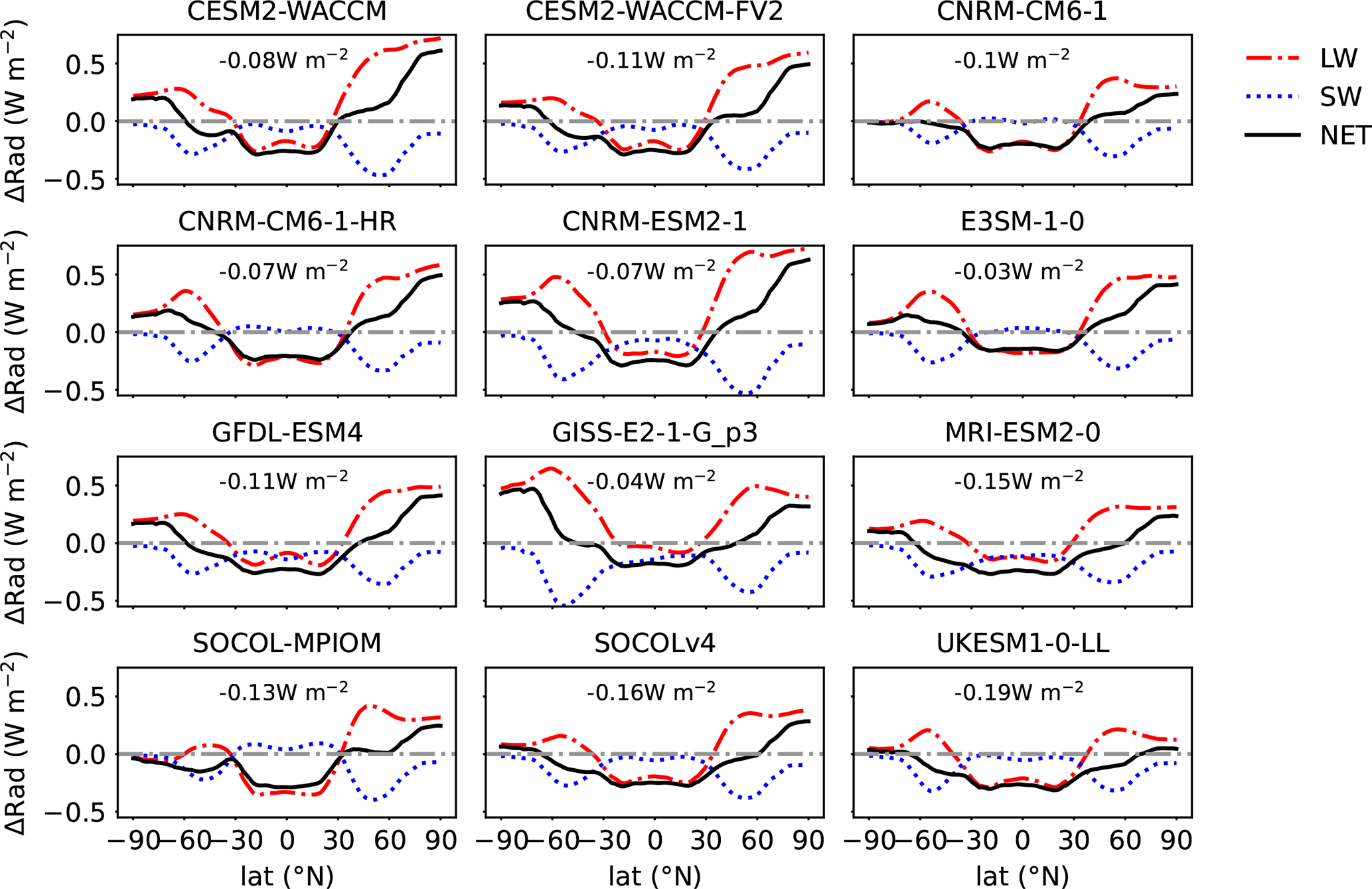 The radiative forcing of the surface–troposphere system due to the perturbation or the introduction of an agent is defined as “the change in net (down minus up) irradiance (solar plus longwave; in W m−2) at the tropopause after allowing for stratospheric temperatures to readjust to radiative equilibrium but with surface and tropospheric temperatures and state held fixed at the unperturbed values” (Ramaswamy et al., 2001). It can be investigated by looking at the difference in radiative fluxes and temperature adjustments between the CESM-PORT reference and perturbation runs.