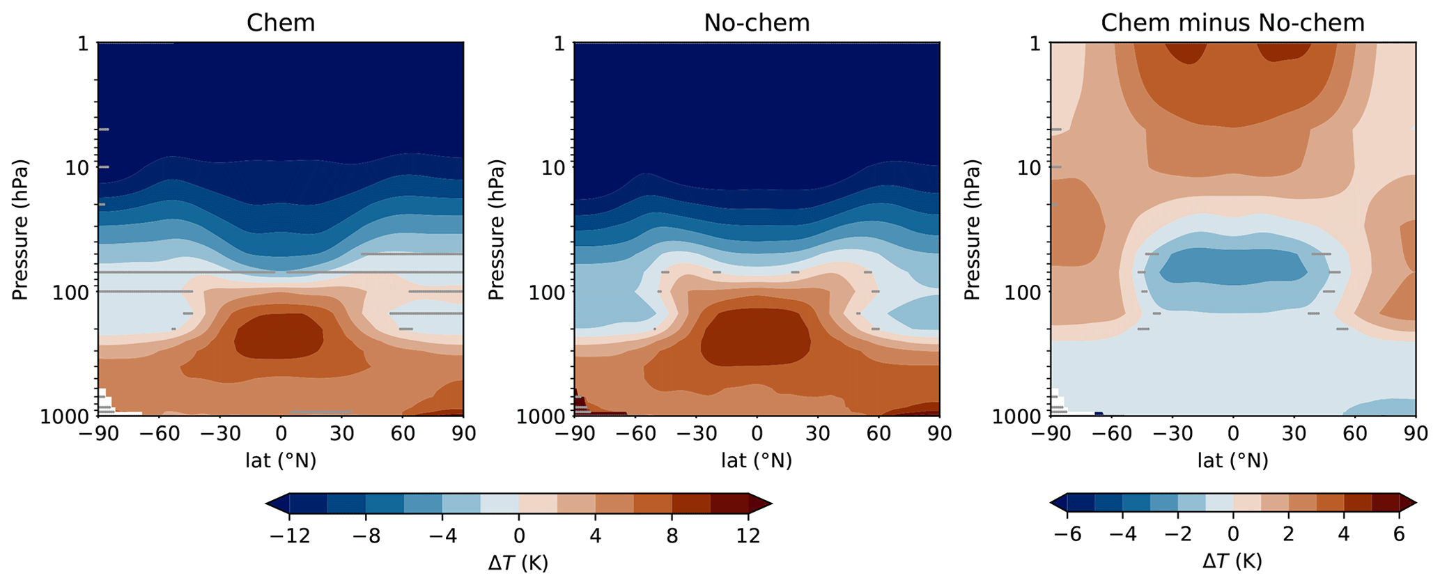 For the comparison of chem and no-chem models, we first remap all models' horizontal grid to the same resolution, which is chosen as 288 × 192. Since all CMIP6 models have 19 pressure levels, vertical interpolation is performed on SOCOLv4 so that the data are on the same pressure levels.