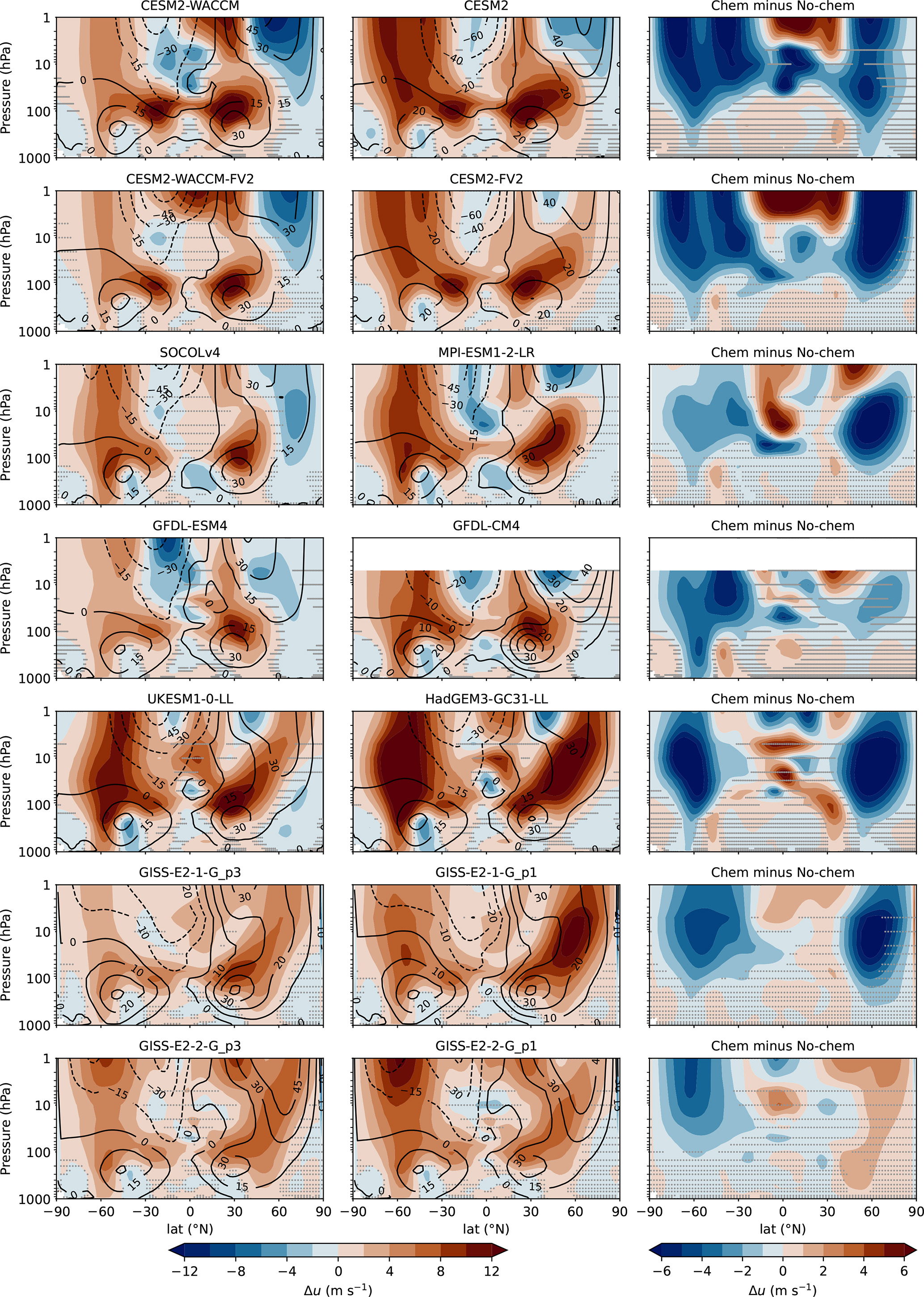 Figure 11Comparison of the 100-year-long seasonal-mean zonal wind response to a 4×CO2 change in DJF between seven pairs of chem and no-chem models. Black contour lines depict the zonal wind climatology from the piControl experiment.