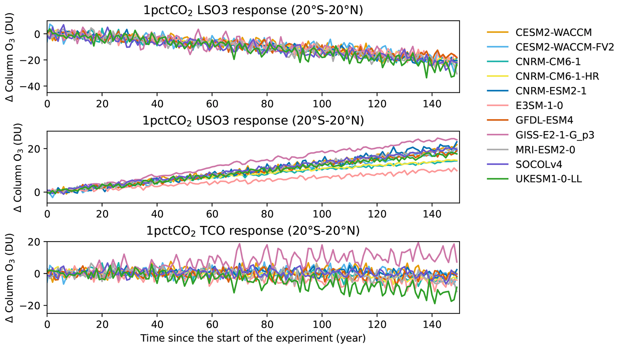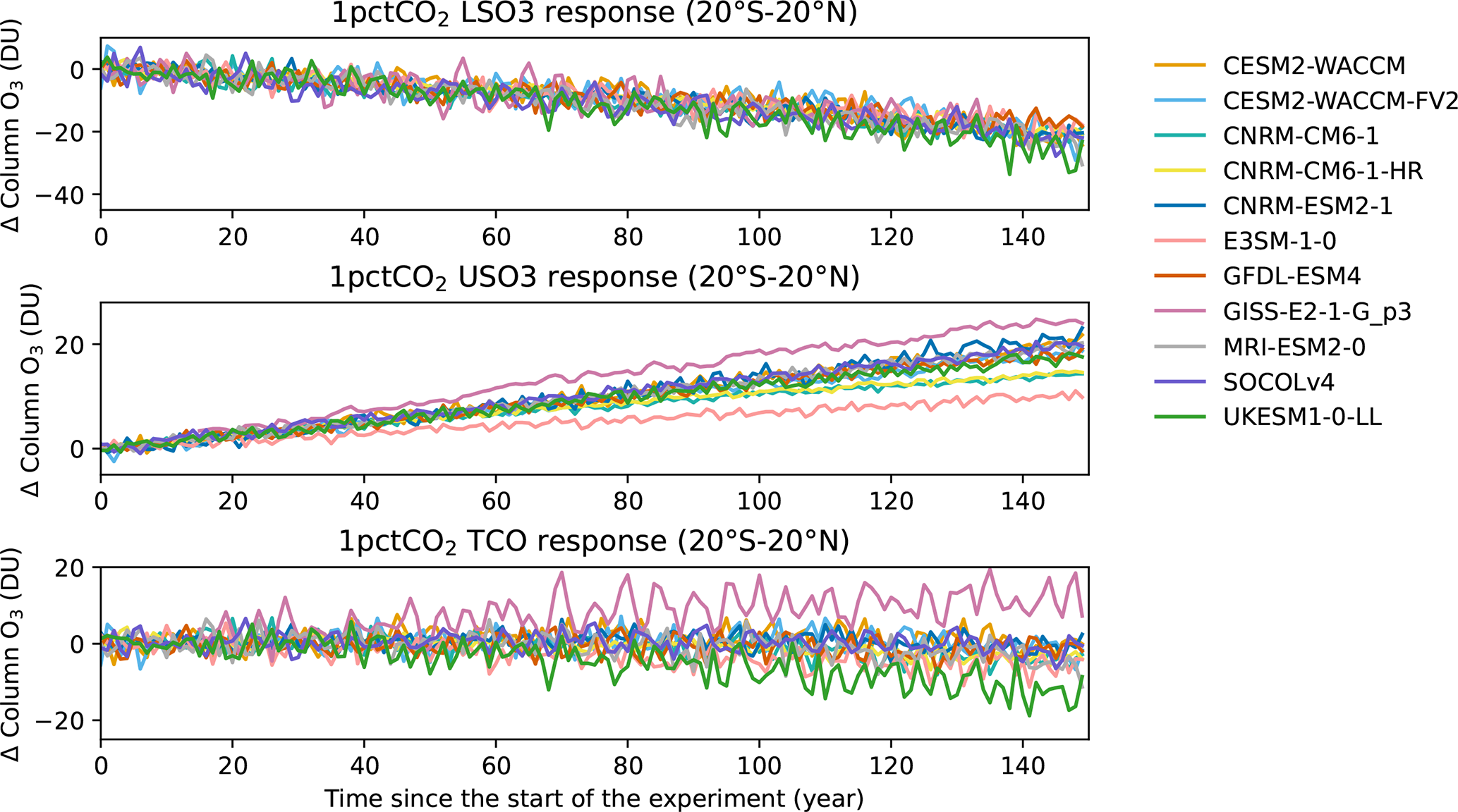 Figure B5150-year-long annual-mean tropical (20° S–20° N) LSO3, USO3, and TCO response to 1pctCO2 with time.