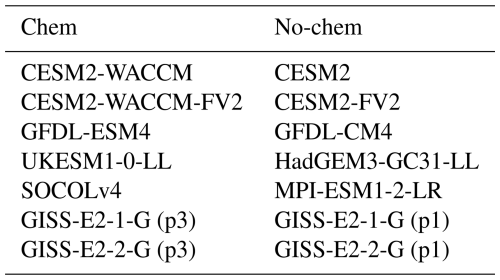 To investigate the impact of interactive chemistry, we compare models that simulate interactive ozone with those that impose a fixed pre-industrial climatological ozone forcing dataset (i.e., the “no-chem” models) from Checa-Garcia et al. (2018), following the method discussed in Morgenstern et al. (2022). We identified seven such “pairs” (Table 2).
