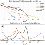 Figure 7Distribution of IWC (a) and Ni with the number of ice particle smaller than 40 µm excluded (b) for model simulations at 20:30 UTC on 7 February 2019 and for the observation data for ICICLE Flight 9 between 20:00 and 21:00 UTC. The results from model simulations are calculated for altitudes between 0.5 and 5.5 km and with ice water content higher than 0.001 g m−3 in the region within 20 km of distance to the aircraft track. The results from in situ observation are calculated for the condition with IWC higher than 0.001 g m−3. (b) logarithmic bin width of of an order of magnitude is used. Blue dashed lines: Baseline simulation, purple dash-dot line: SIP (F9-HMr-FFDh), yellow dotted lines: SIP (F9-HMgr-FFDh) simulation, red lines: SIP (F9-HMgc-FFDh) simulation, green dashed lines: SIP (F9-HMgc-FFDl-CB), black lines: observation.