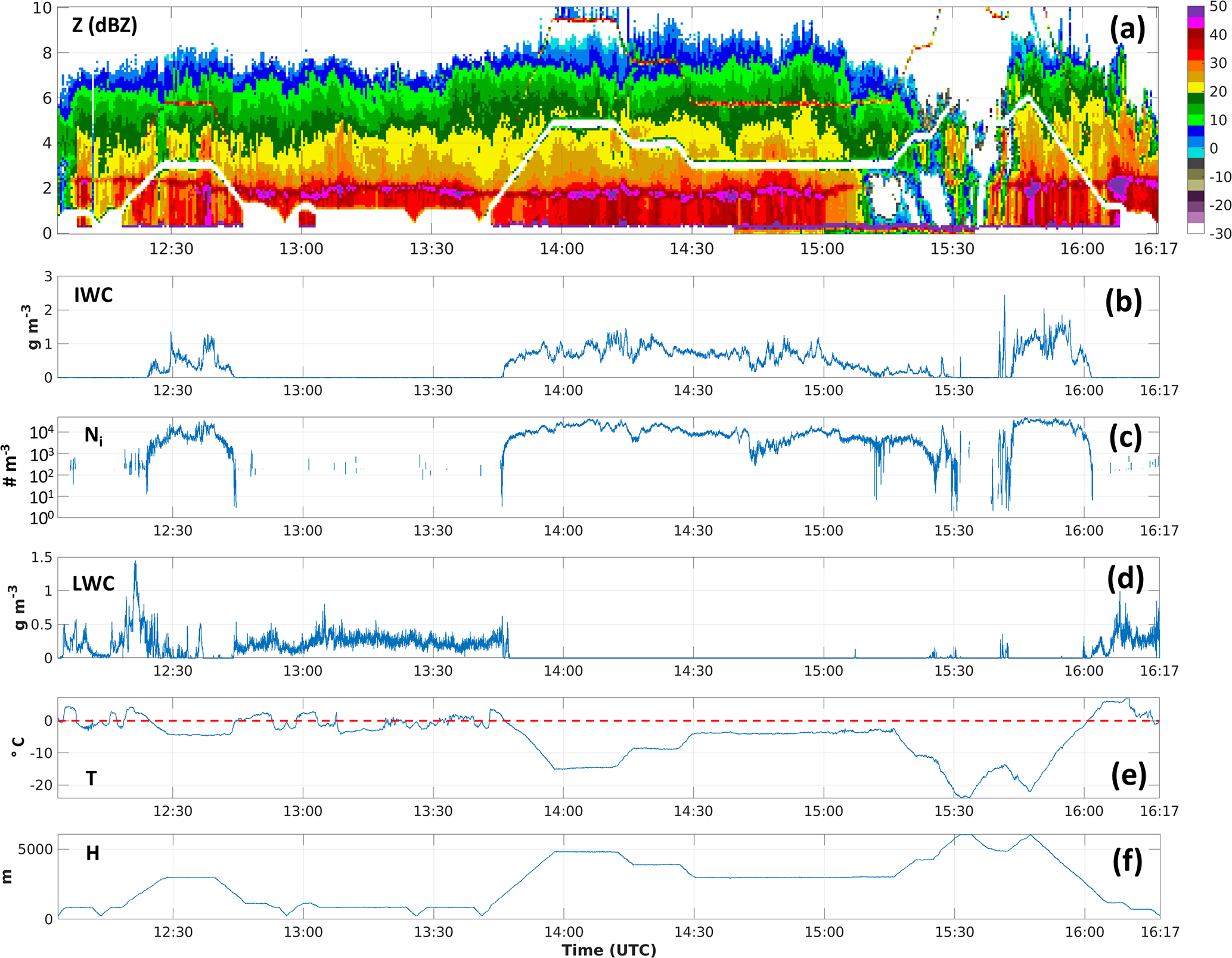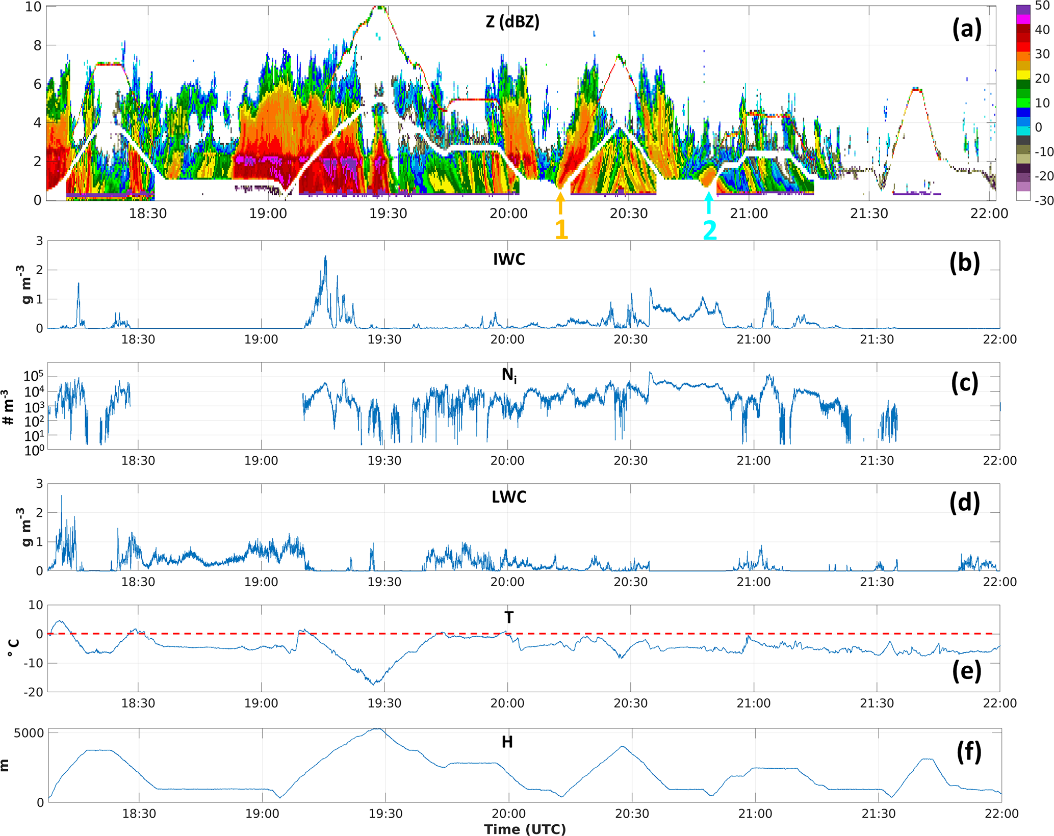 Figure 3 shows the combined zenith and nadir pointing X-band radar reflectivity along with in situ observations of IWC, ice number concentration (Ni, excluding particles smaller than 40 µm in diameter), LWC, air temperature (T), and the aircraft's altitude (H). The bright band at approximately 2.5 km is clearly visible before 20:00 UTC, but it disappears after 20:30 UTC. A temperature inversion is present near an altitude of 2 km, although the maximum temperature at this altitude remains below freezing after 20:00 UTC. Based on in situ observations there are many regions of mixed-phase clouds, particularly between 19:50 and 20:40 UTC and around 21:00 UTC, which provide potential favourable conditions for SIP.