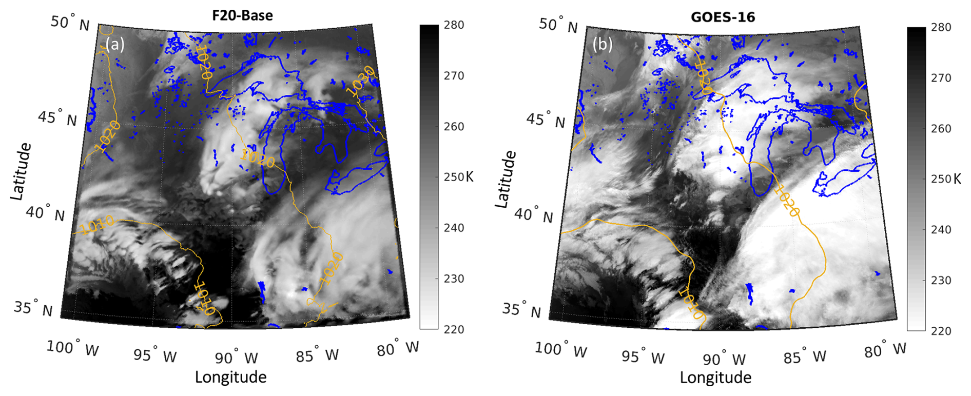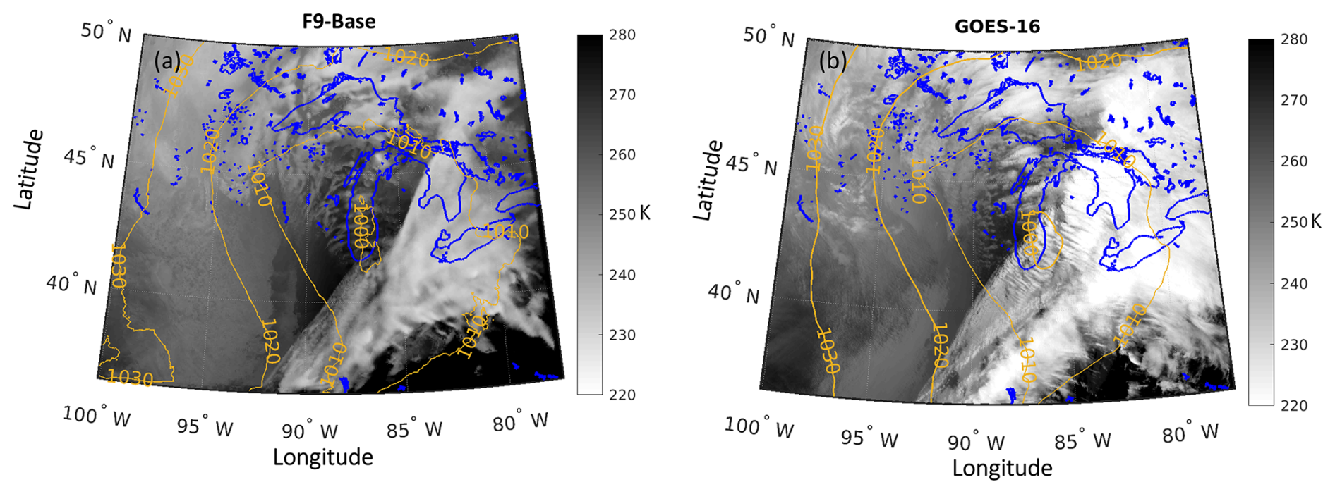 Figure 4(a) Brightness temperature at 10.3 µm simulated using RTTOV (Saunders et al., 2018) with the BASE simulation at 2.5 km resolution for 20:30 UTC on 9 February 2019. (b) Observed brightness temperature from GOES-16 for 20:30 UTC on 9 February 2019. Blue lines indicate lake boundaries, while yellow lines represent sea-level isobars: from the F9-BASE simulation at 20:30 UTC in panel (a) and from ECCC's regional prediction model at 20:30 UTC initiated at 18:00 UTC in panel (b).