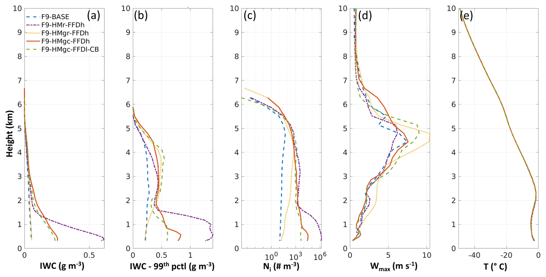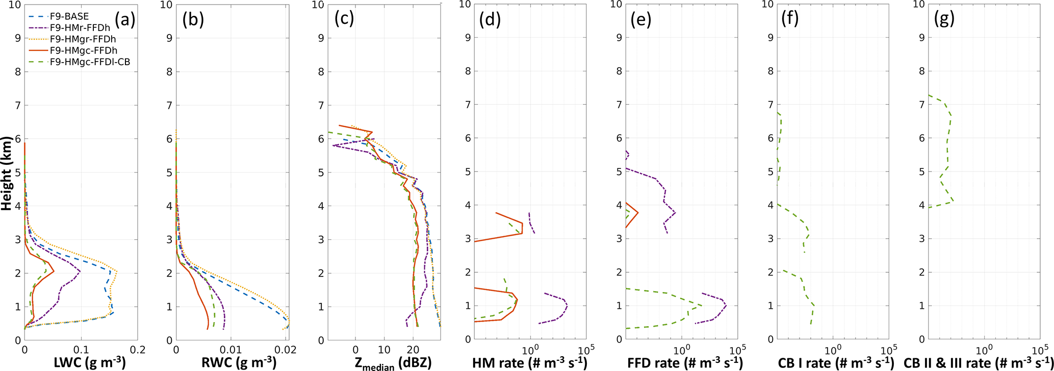 Including the CB process in the experiment led to an explosive increase in FFD rates near the surface (not shown). To mitigate this, we applied the FFDl (lower rate) parameterization, as proposed by Lachapelle et al. (2025). Results from the three-process experiment (F9-HMgc-FFDl-CB) were similar to those of F9-HMgc-FFDh in terms of Ni, IWC, LWC, and Zmedian. The CB process (types I, II, and III) produced positive SIP rates at multiple altitudes, including levels below 2 km (Fig. 6f, g), potentially further activating the FFD process. The use of the FFDl parameterization effectively suppressed near-surface FFD rates, resulting in values that were substantially lower and more realistic.In the simulations for Flight 9, condensation freezing/deposition ice nucleation likely initiated ice particle formation at altitudes above 4.5 km (T< −15 °C, as implemented in P3 scheme). As these ice crystals descend, they tend to aggregate, leading to decreased Ni values (typically less than 102 m−3) (see Fig. 7b, blue dashed line from the F9-BASE simulation). In addition, the immersion/contact freezing process could also introduce low number of Ni at higher T (T< −4 °C). Ice particles produced via heterogeneous nucleation can subsequently trigger the HM or CB processes. However, since Ni generated by heterogeneous nucleation remains low at lower altitudes, where supercooled liquid drops are abundant, the likelihood of activating significant FFD rates is limited. In contrast, the HM and CB processes can produce Ni values at least an order of magnitude higher than those from heterogeneous nucleation alone, substantially increasing the potential for interactions between ice splinters and supercooled raindrops.
