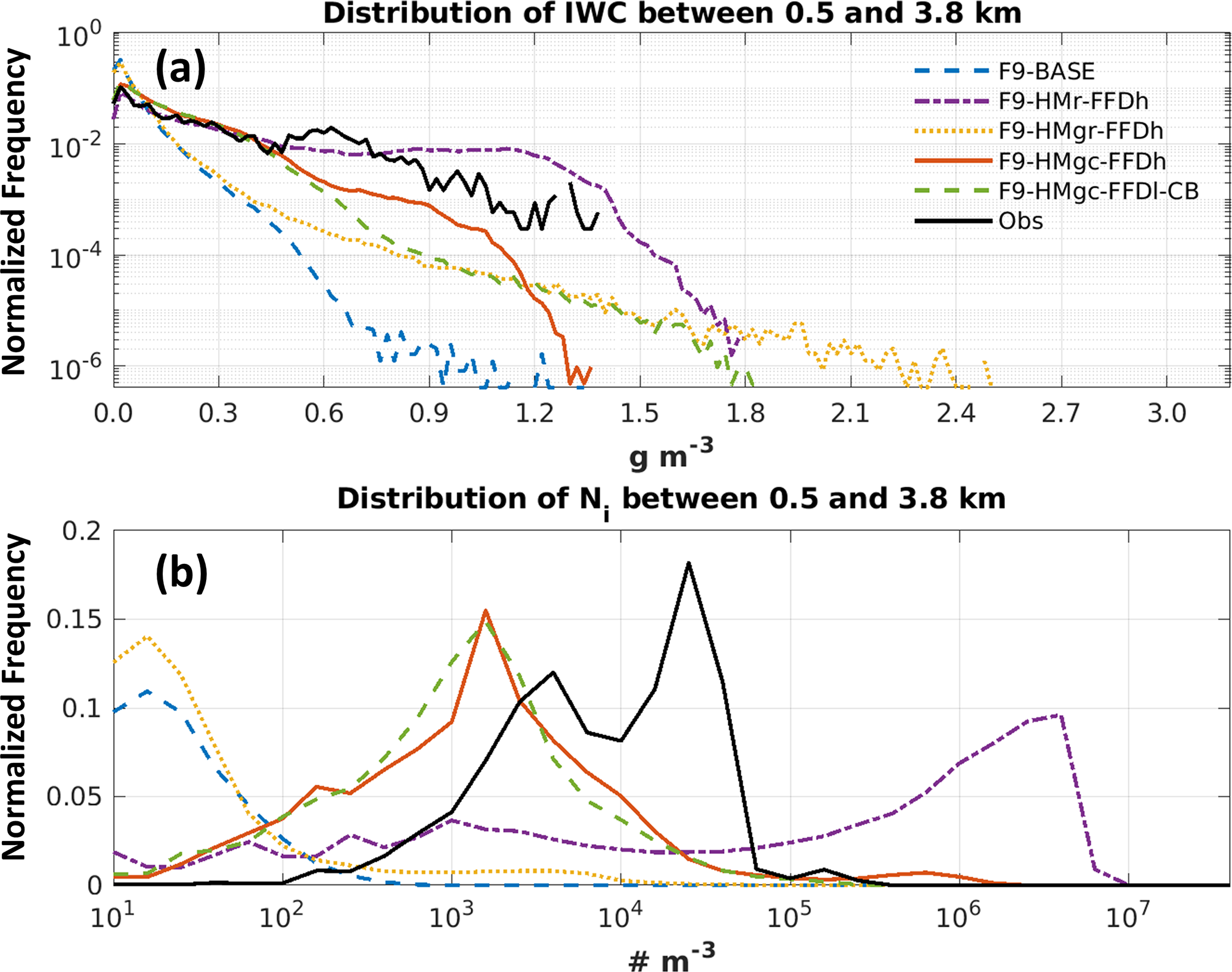 To further assess the simulation results, in situ aircraft data were used for comparisons. Figure 7 compares the distributions of simulated IWC and Ni within 10 km of the flight track and within the flight altitude range of 0.5 to 3.8 km, with the observations shown by black lines. In the simulation results presented here, quantities from all four ice categories are summed and for the simulated Ni, ice particles smaller than 40 µm are excluded.