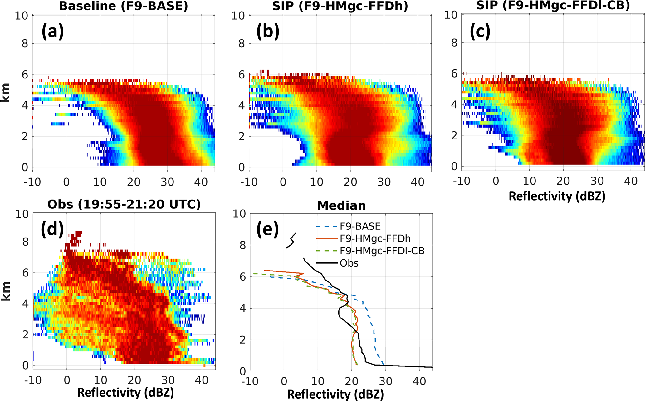 Figure 9Z distribution frequency for (a) Baseline simulation, (b) SIP (F9-HMgc-FFDh) simulation, (c) SIP (F9-HMgc-FFDl-CB), (d) observation from Flight 9 between 20:10 and 20:50 UTC, and (e) the median values for each altitude for the three model simulations and observations.