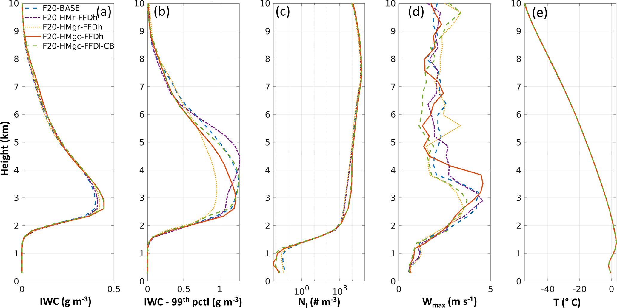 Figure 5Profiles from the baseline and SIP simulations on 7 February 2019 for the case of ICICLE Flight 9. (a) Mean IWC, (b) 95 percentile of IWC (99th pctl of IWC), (c) mean Ni with the number of ice particle smaller than 40 µm excluded, (d) maximum vertical wind speed (wmax), (e) T (the three simulations have only slightly different temperature that is not distinguishable in the figure). All profiles are calculated from simulation results at 510 min (20:30 UTC) after the initiation time of 12:00 UTC. All profiles are calculated for the region within 10 km of distance to the aircraft track.